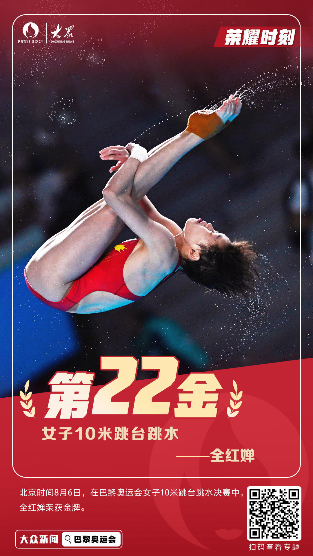 8月6日,在巴黎奥运会跳水女子10米台决赛中,中国选手全红婵成功卫冕,夺得金牌!这枚金牌是中国代表团在本届奥运会获得的第22枚金牌。中国队实现该项目五连冠!