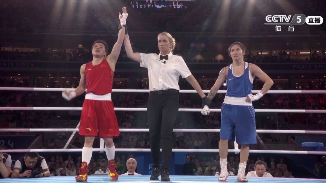 巴黎奥运会拳击女子50公斤级半决赛,中国选手吴愉战胜哈萨克斯坦选手,闯入决赛。加油!