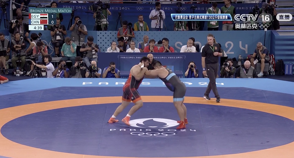 北京时间8月7日,在巴黎奥运会摔跤男子古典式130公斤级铜牌赛中,中国选手孟令哲战胜埃及选手,夺得铜牌。