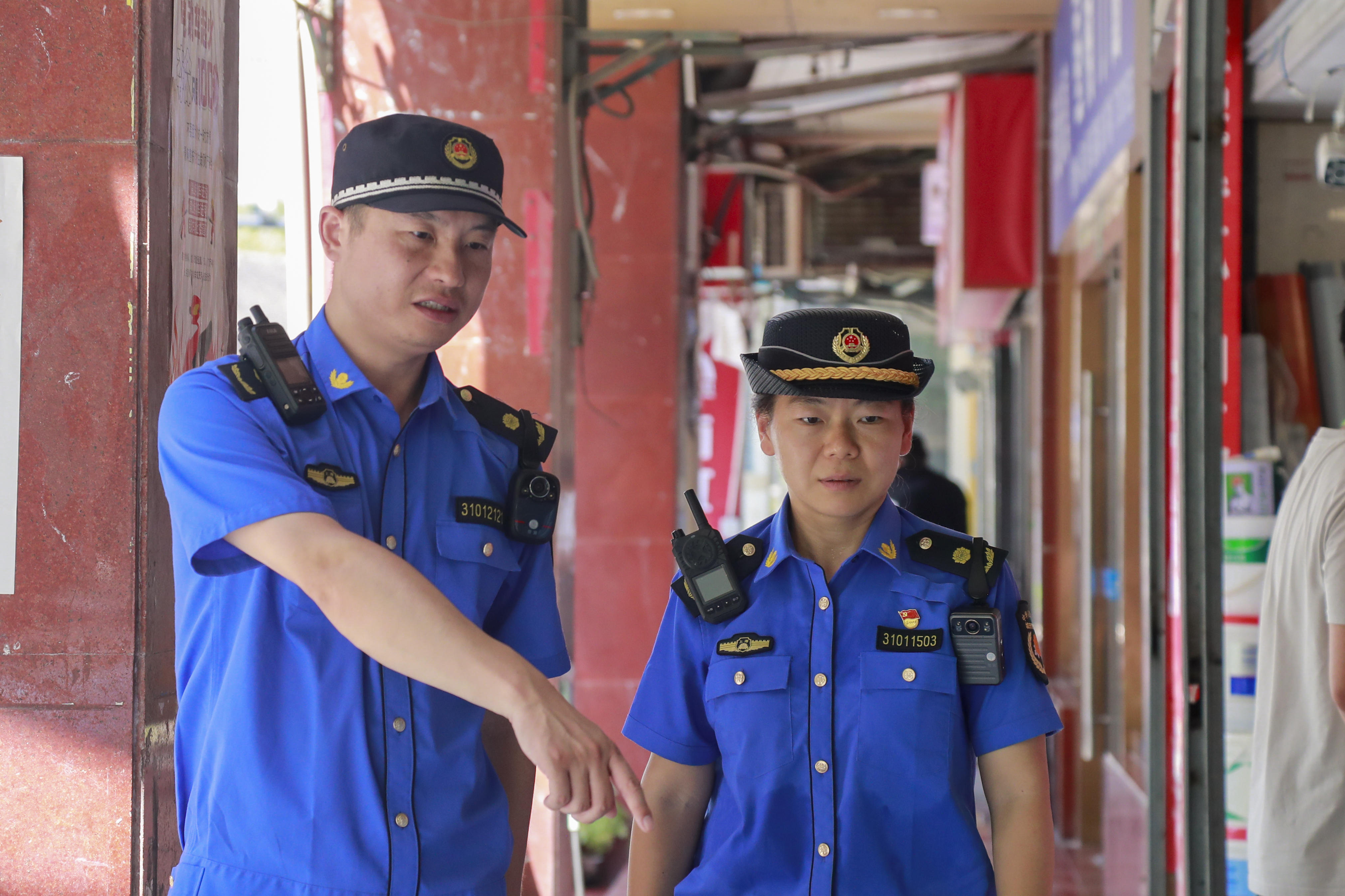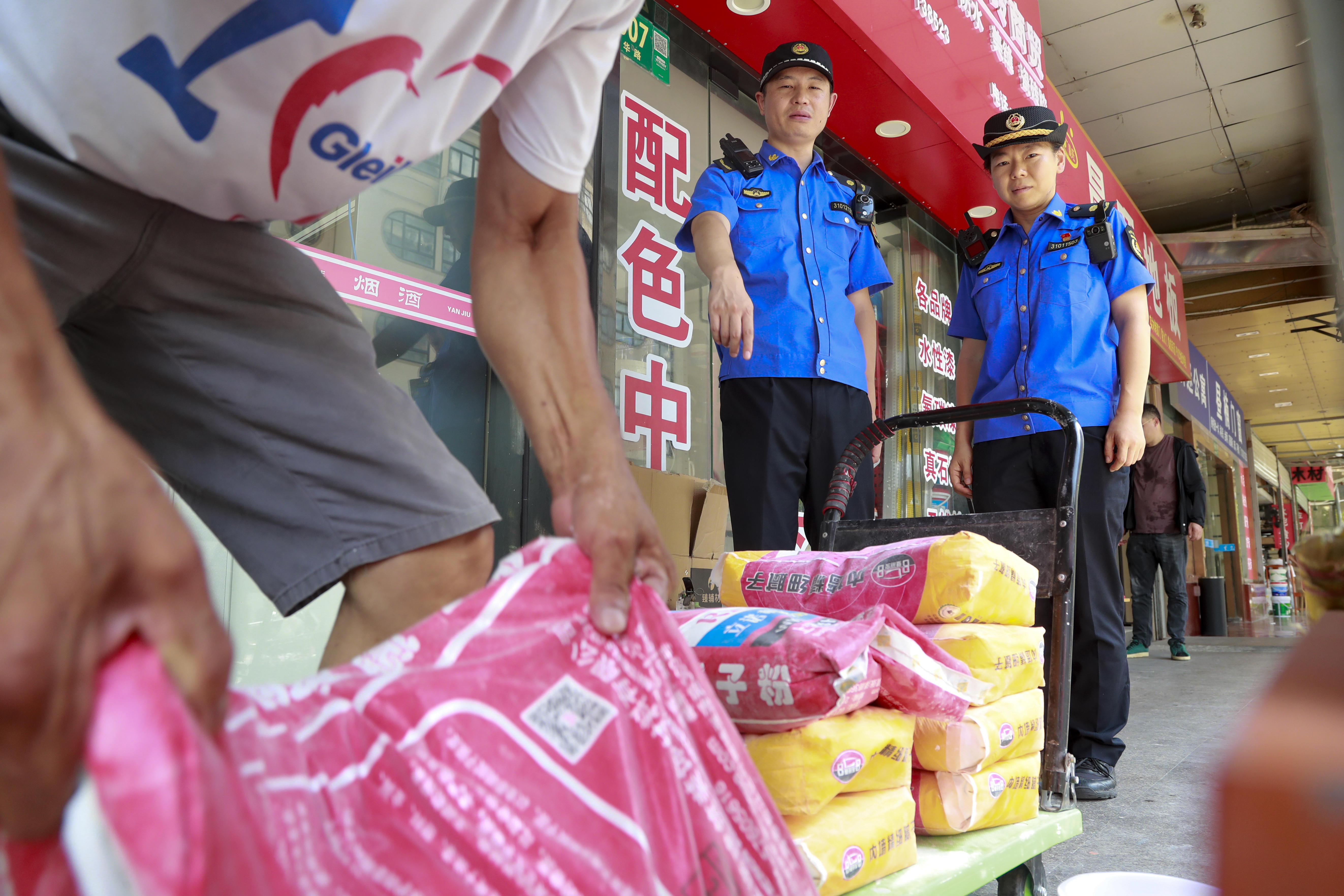 上午9点,施爱林和关瑜杰已经在辖区内开始忙碌,他们负责的辖区内沿街商铺共有50户,3家餐饮,5个商品房小区内目前共有910户居民。走在沿街商铺密集的区域,施爱林和关瑜杰整治街路两旁跨门、占道经营现象,纠正乱摆乱堆乱放等不文明行为。每走进一家店铺,他们认真查着各类相关证件是否齐全、有效,施爱林仔细核对证件上的信息,不放过任何细节。关瑜杰则专注地检查商品的摆放是否符合规定。“老板,您看,这些物料堆放在上街沿,影响路人通行,也不规范。”在一户家装店,施爱林和关瑜杰发现店主将一袋袋装修材料随意地摆到了店外,他们耐心地向店主解释相关规定,“其实类似的情况时有发生,或是疏忽或是顺手一丢,但这一不留意可能就会成为安全隐患。”关瑜杰告诉记者,他们每天对街面的巡逻,坚持服务与管理、教育与劝导相结合,保证沿街商铺规范经营、提升环境卫生的整洁有序。