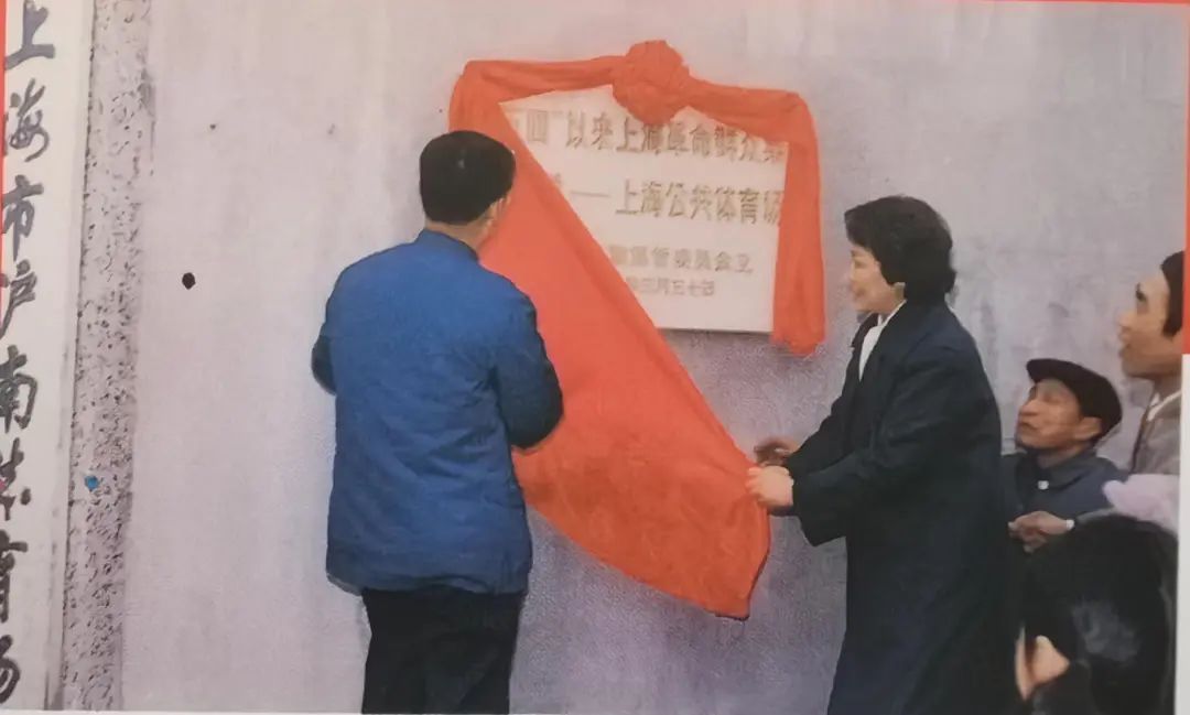 沪南体育场在建场七十周年之际,被确定为市级文物保护单位。图为时任副市长谢丽娟(左二)为纪念牌揭幕