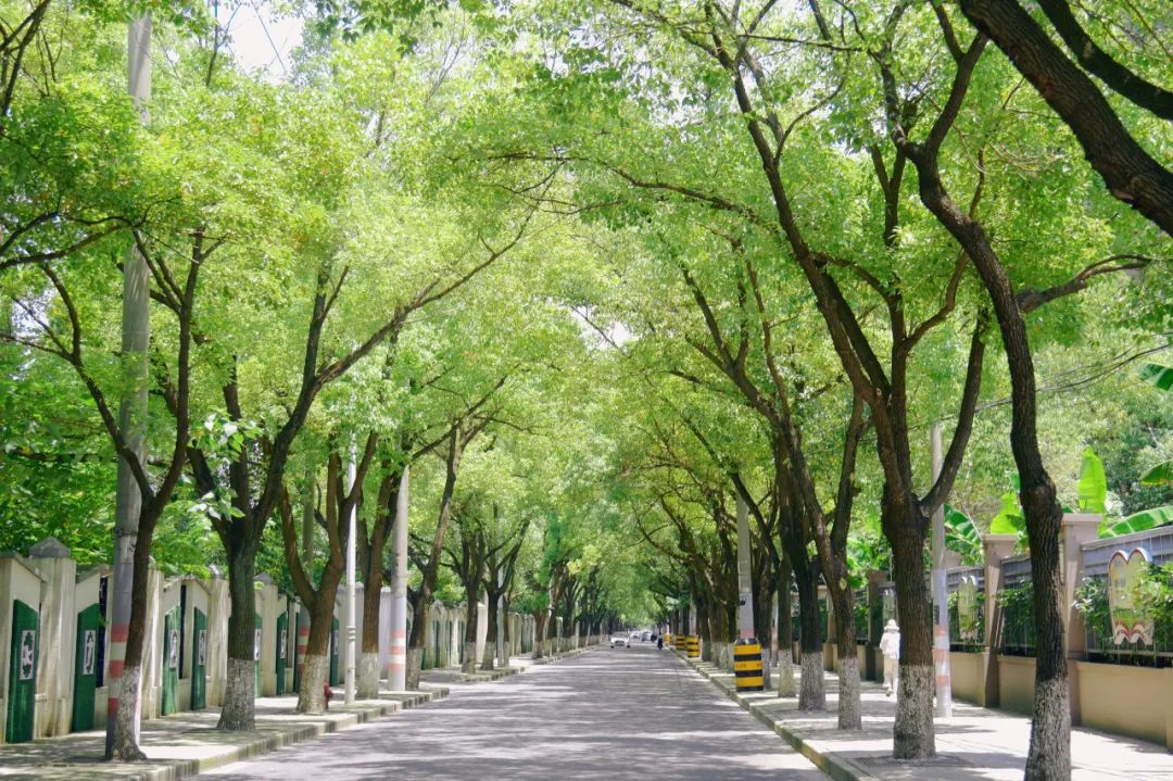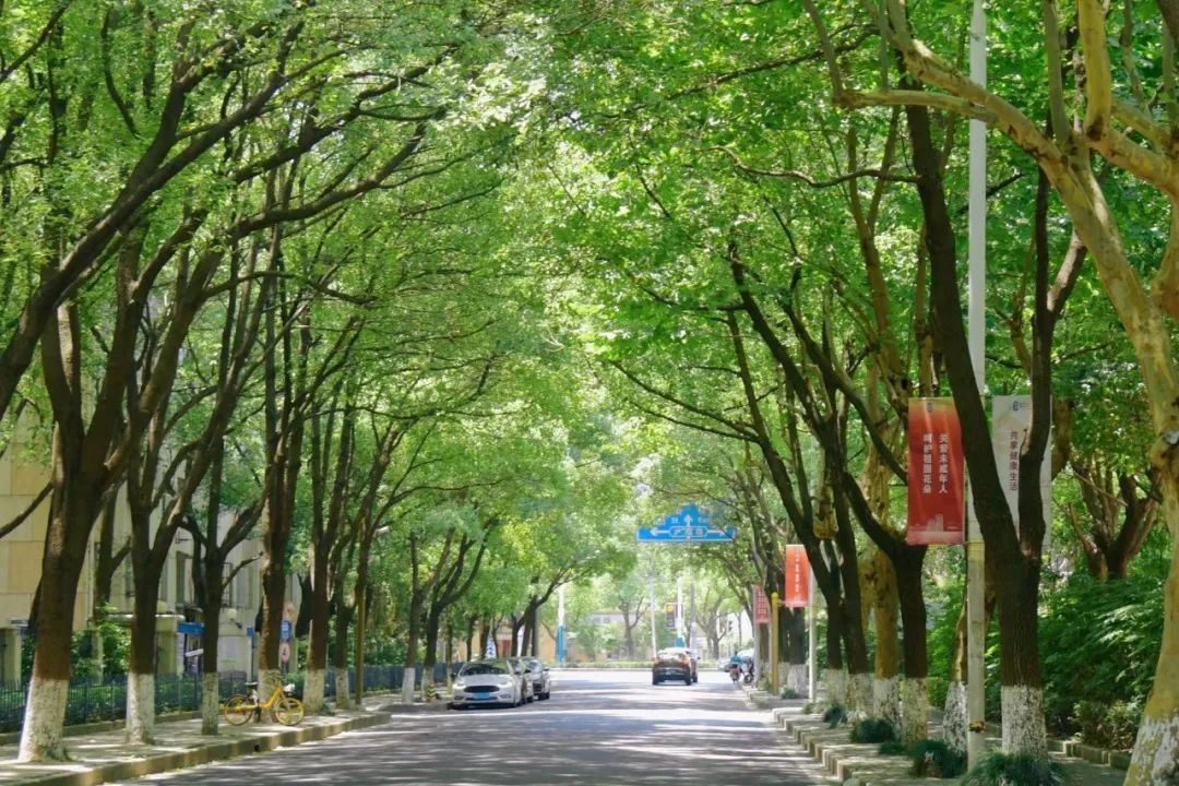 雪家桥路整条道路幽静整洁、郁郁葱葱,两侧行道树相连,枝繁叶茂形成一连排树荫,树冠相互交合,营造出一片绿意盎然。