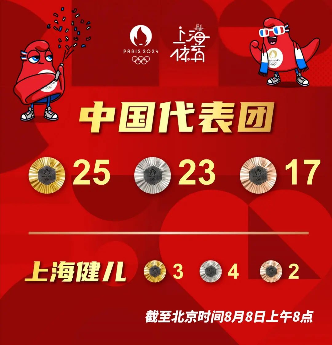 巴黎时间8月7日,中国健儿在晚场赛事多线发力:花游姑娘首夺奥运金牌,侯志慧在举重女子49公斤级比赛中最后一把破纪录绝杀对手成功卫冕,跆拳道、摔跤收获奖牌,中国女曲再胜强敌晋级决赛……最终,中国体育代表团延续良好表现,全天收获3金2银1铜。