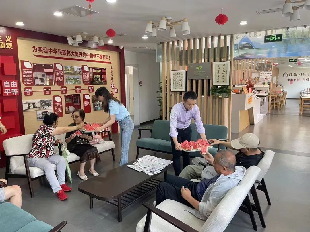 活动当天,中正达广基金党支部代表带着降暑物资踏入了服务站。居民区党总支书记吴菊玲与共建单位党支部代表端出新鲜现切的西瓜,为老年人日间照料中心的老人们驱散夏日的燥热。