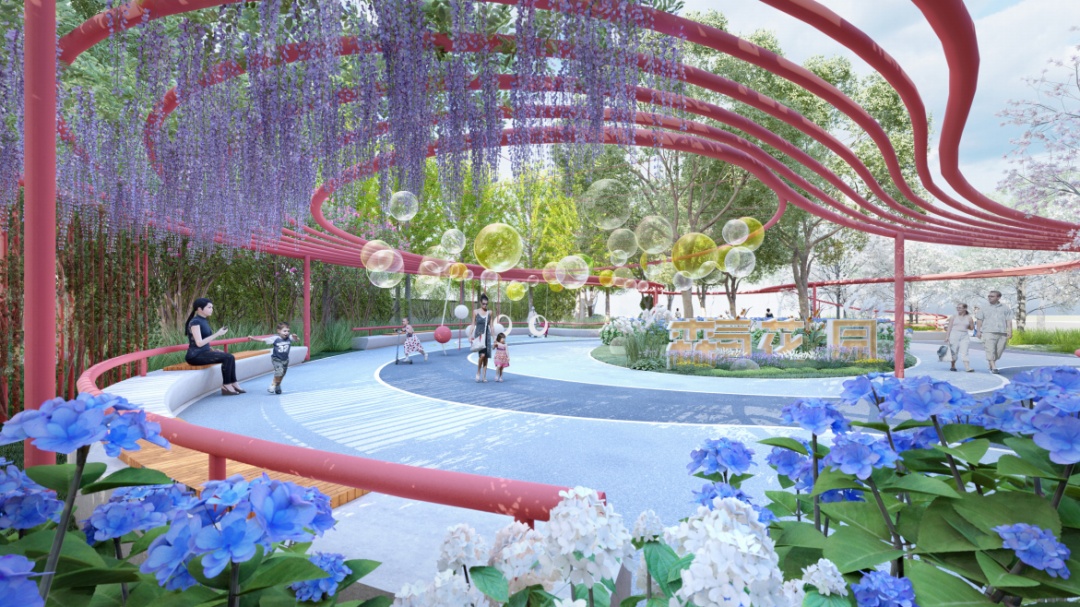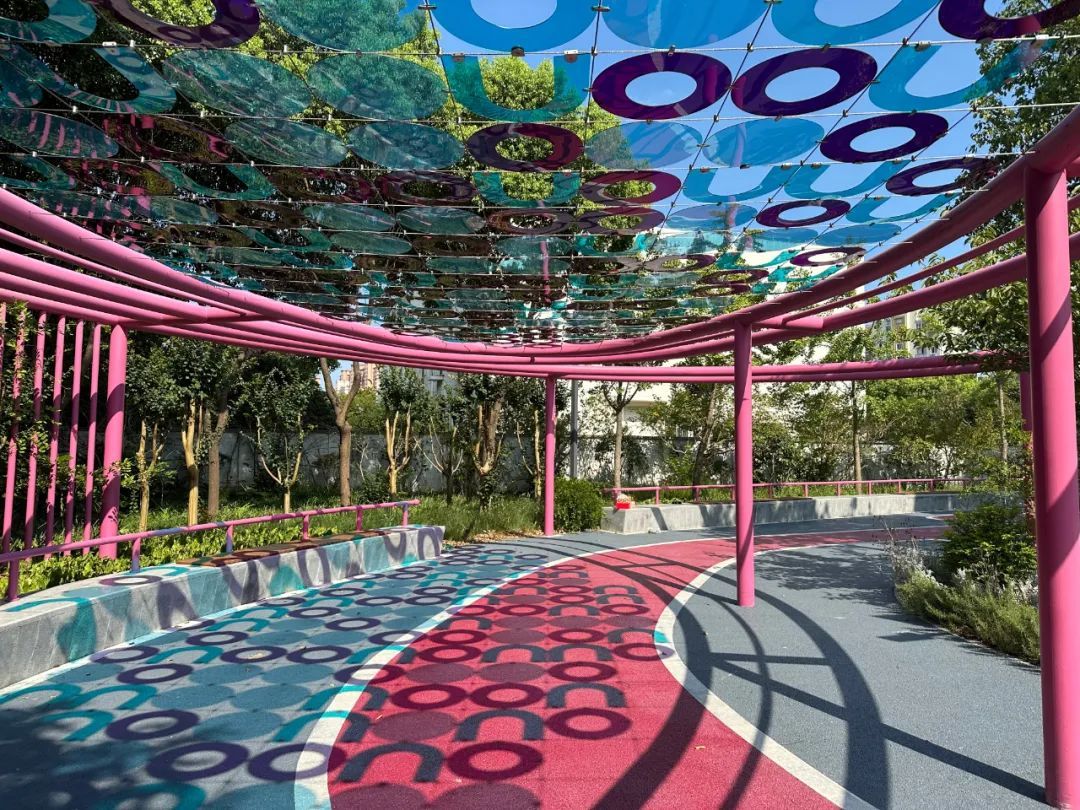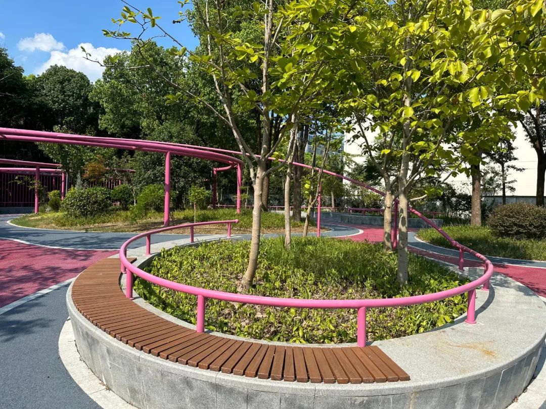 据介绍,这个口袋公园在绿化改造中以白玉兰为主要特色乔木,下层植被以浦江镇镇花萱草花及八仙花为主。洁白的玉兰,辅以绚烂多彩的八仙花和萱草花,让绿化景观更怡人。“此次改造提升了植物的多样性,让居民在各种时令来到公园,都能感受到不同季节的自然美景。”浦江镇相关部门负责人说。上海,因水成陆、因水聚人、因水立业。浦江镇不仅名字内含水的寓意,其精神谱系也与水密不可分。森氧花园的设计融入了流动的水形,头顶廊架设计让人仿佛置身于波光粼粼中。这里还巧妙利用色彩间的明暗、冷暖等关系,铺设彩色沥青地面,为居民提供具有丰富色彩的休息环境。此外,公园内布置了较多的休憩空间,也成为居民休息、交谈、观赏的小天地。“小口袋”装着“大幸福”。未来,闵行区将深入践行人民城市理念,持续打造“转角就能邂逅”的小公园,满足居民日常休闲需求,进一步提升城市品质形象和居民的获得感、幸福感。