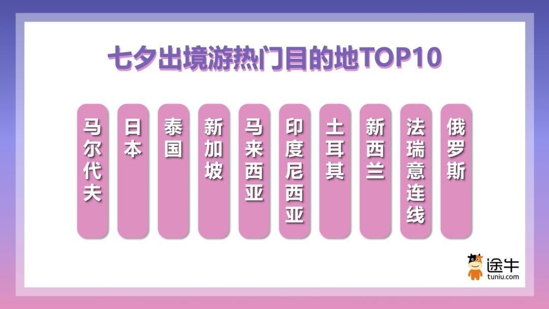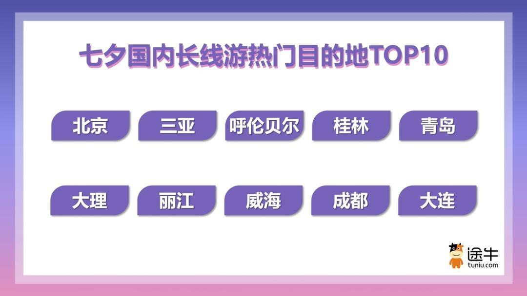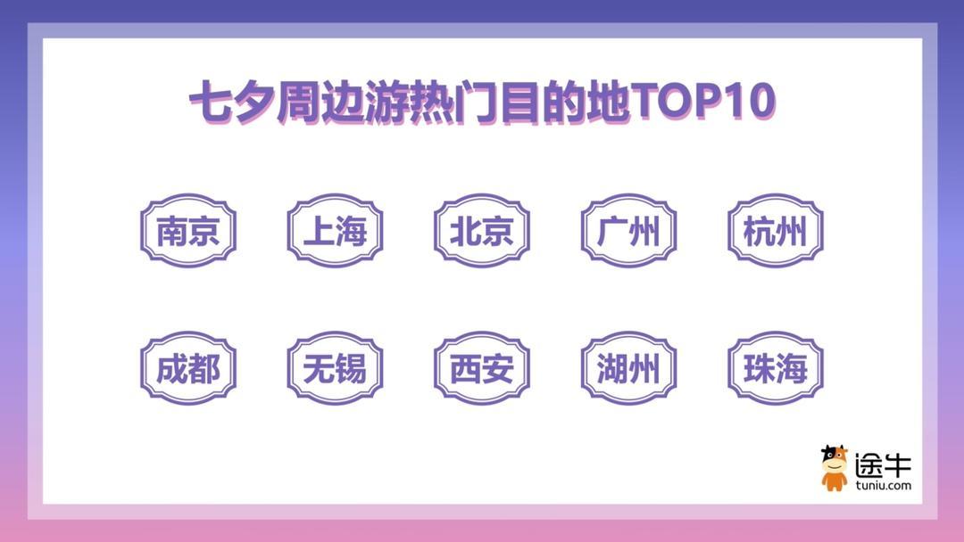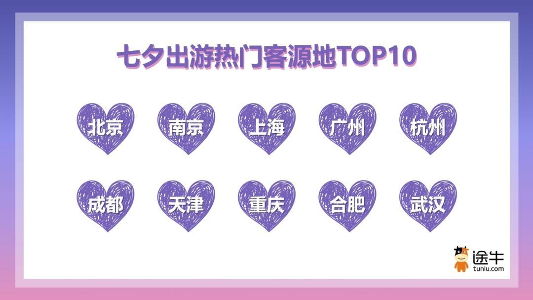 途牛截至目前最新预订数据显示,北京、南京、上海、广州、杭州、成都、天津、重庆、合肥、武汉等地用户更热衷于通过旅行的方式增加七夕的仪式感和浪漫体验。