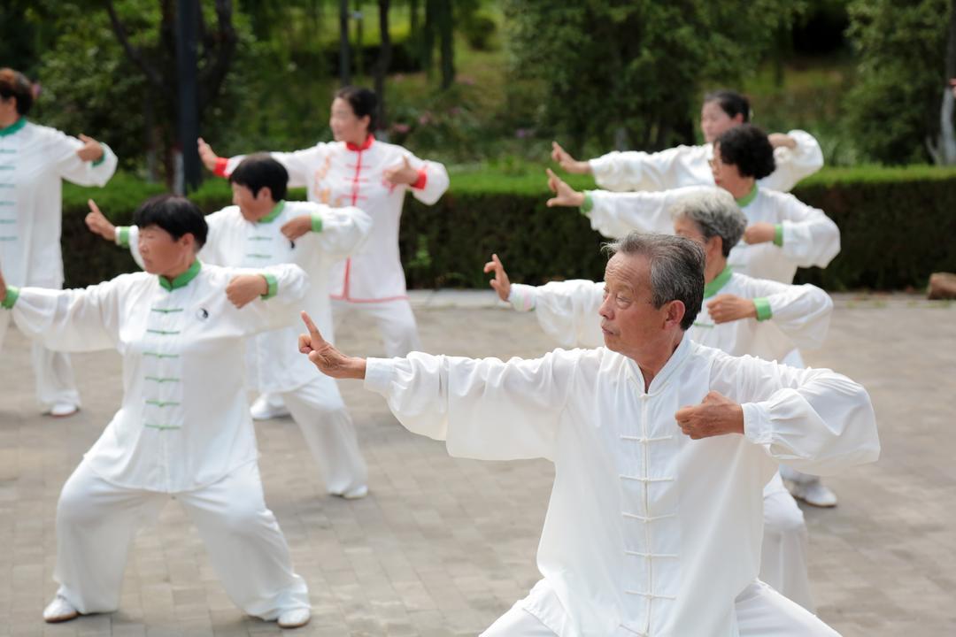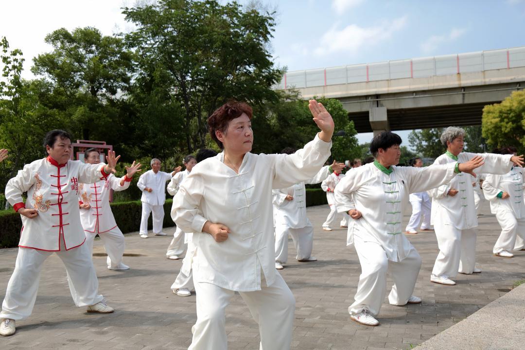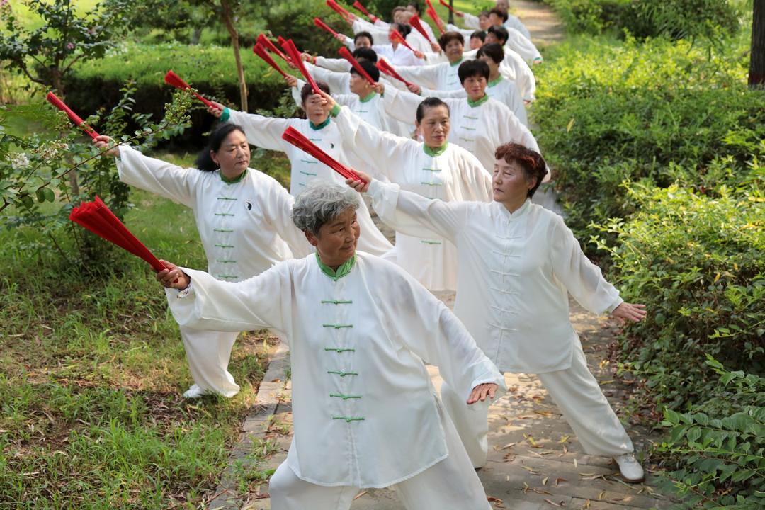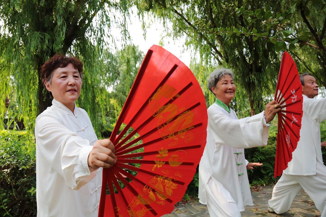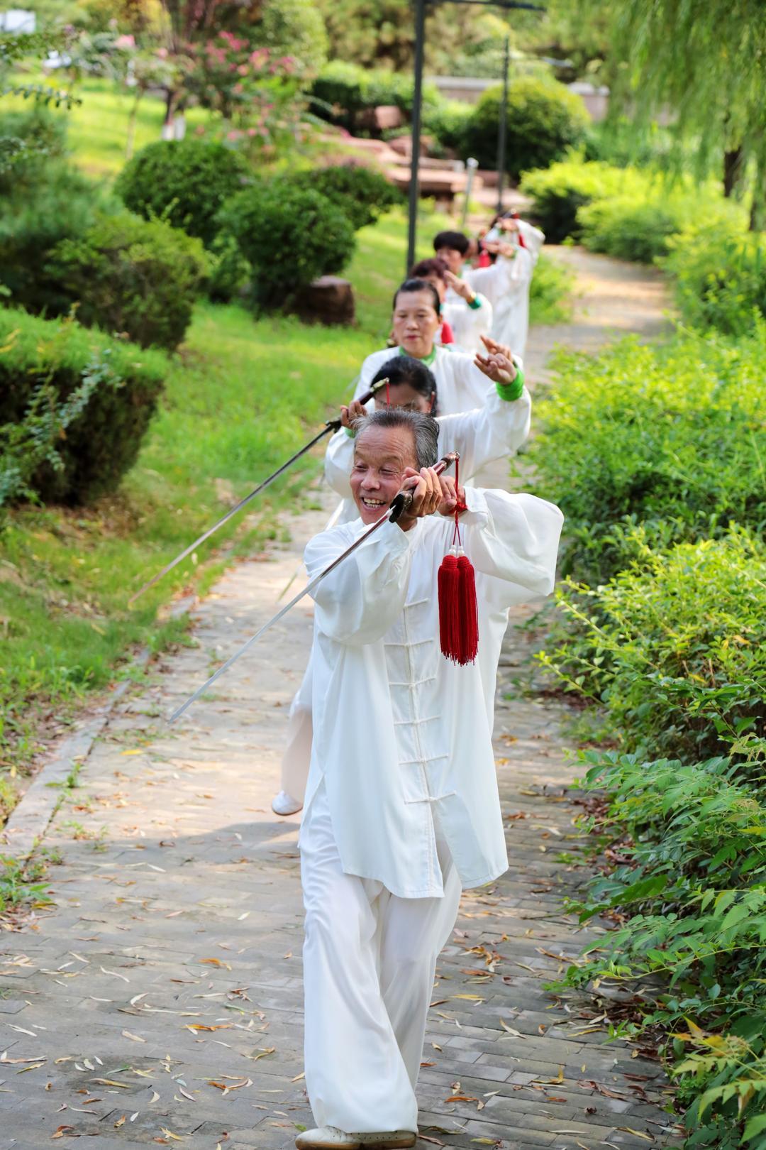 8月8日,枣庄老年太极爱好者们在一处广场,展示了24式简化太极拳、32式太极剑、太极功夫扇等多种拳(剑)法,一招一式,刚柔并济,展现了健康向上的精神风貌及全民健身的丰硕成果。