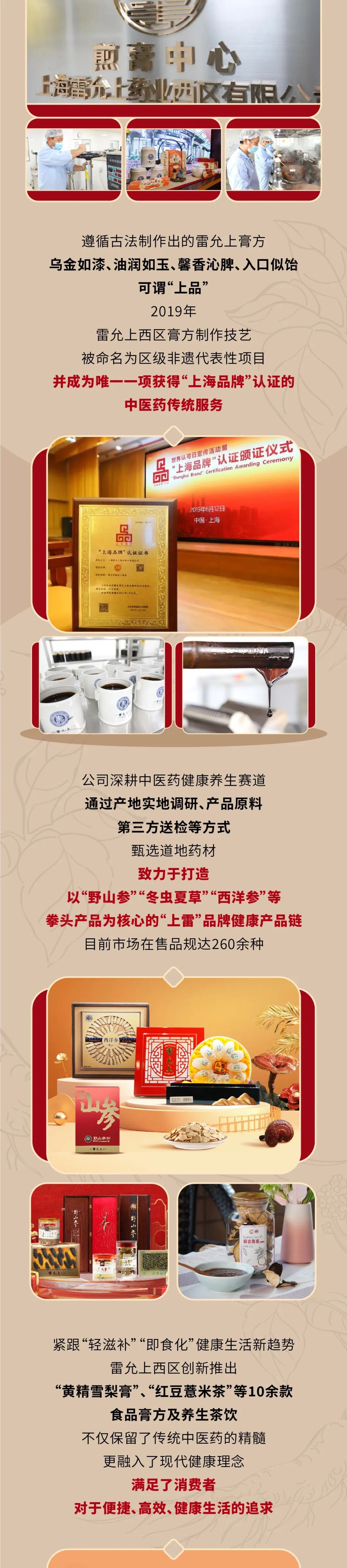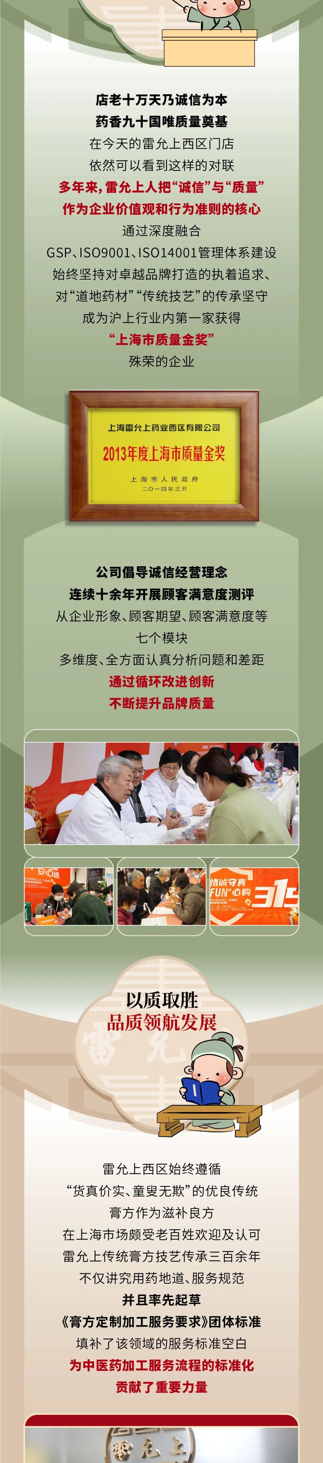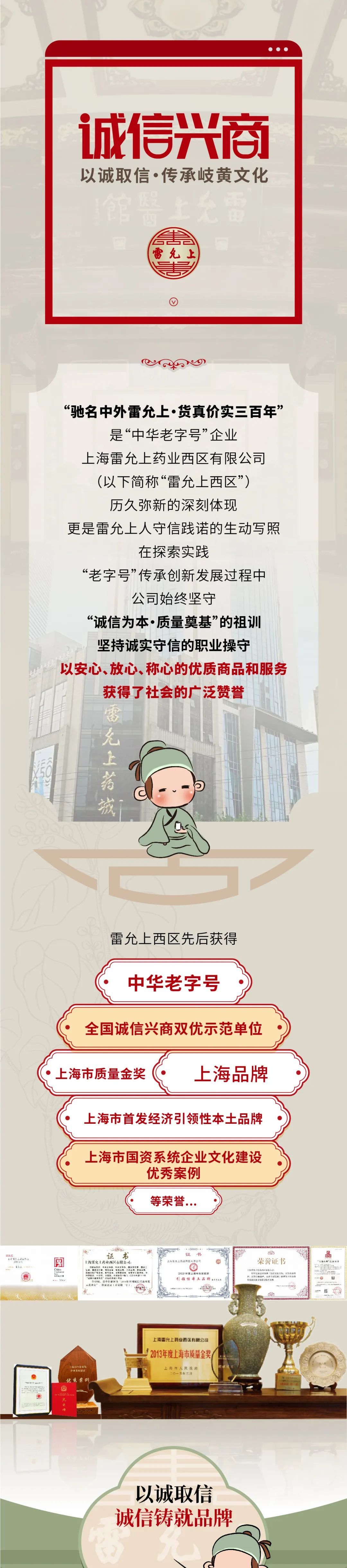 为全面贯彻落实党的二十大和中央经济工作会议精神,扎实开展“诚信兴商宣传月”20周年系列活动,根据商务部关于开展“诚信兴商”典型案例推荐的工作要求,市商务委于近期会同有关部门和单位评选出了本市2024年度“诚信兴商”典型案例和优秀案例。今天分享的优秀案例是:以诚取信 传承岐黄文化——上海雷允上药业西区有限公司。