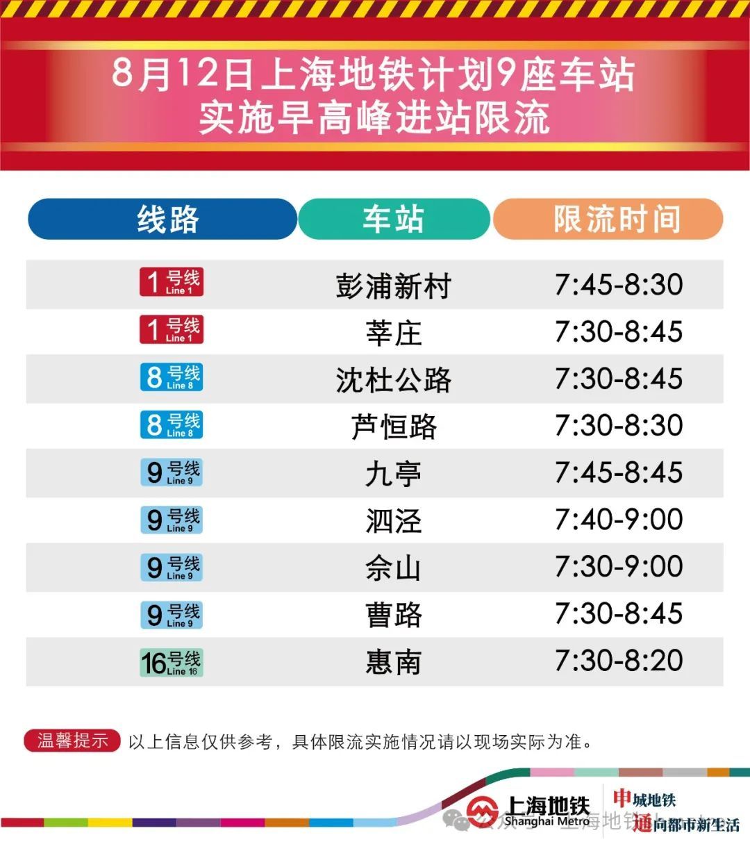 8月12日早高峰沈杜公路、芦恒路等9座地铁站计划限流