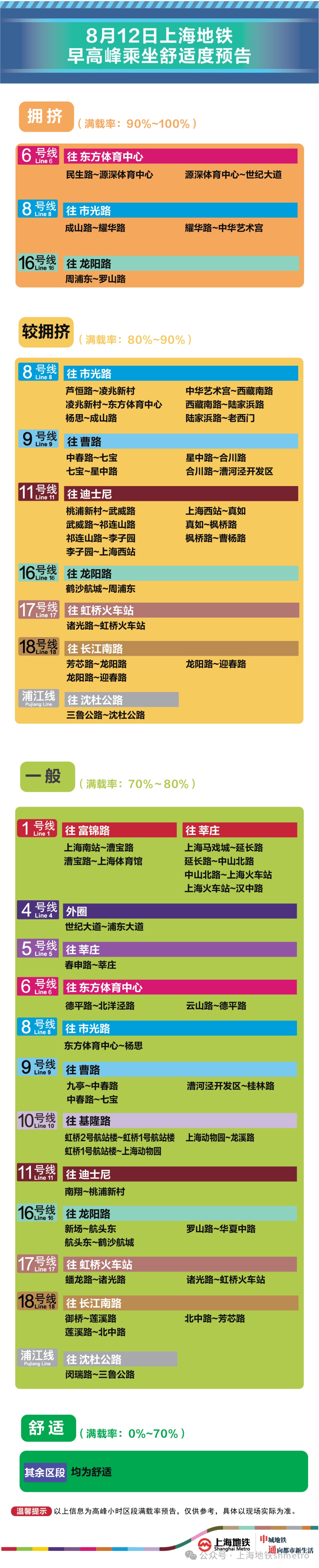 为提升上海地铁早高峰期间出行服务水平,提升乘客乘坐体验,上海地铁向乘客提供乘坐舒适度预告,方便乘客提