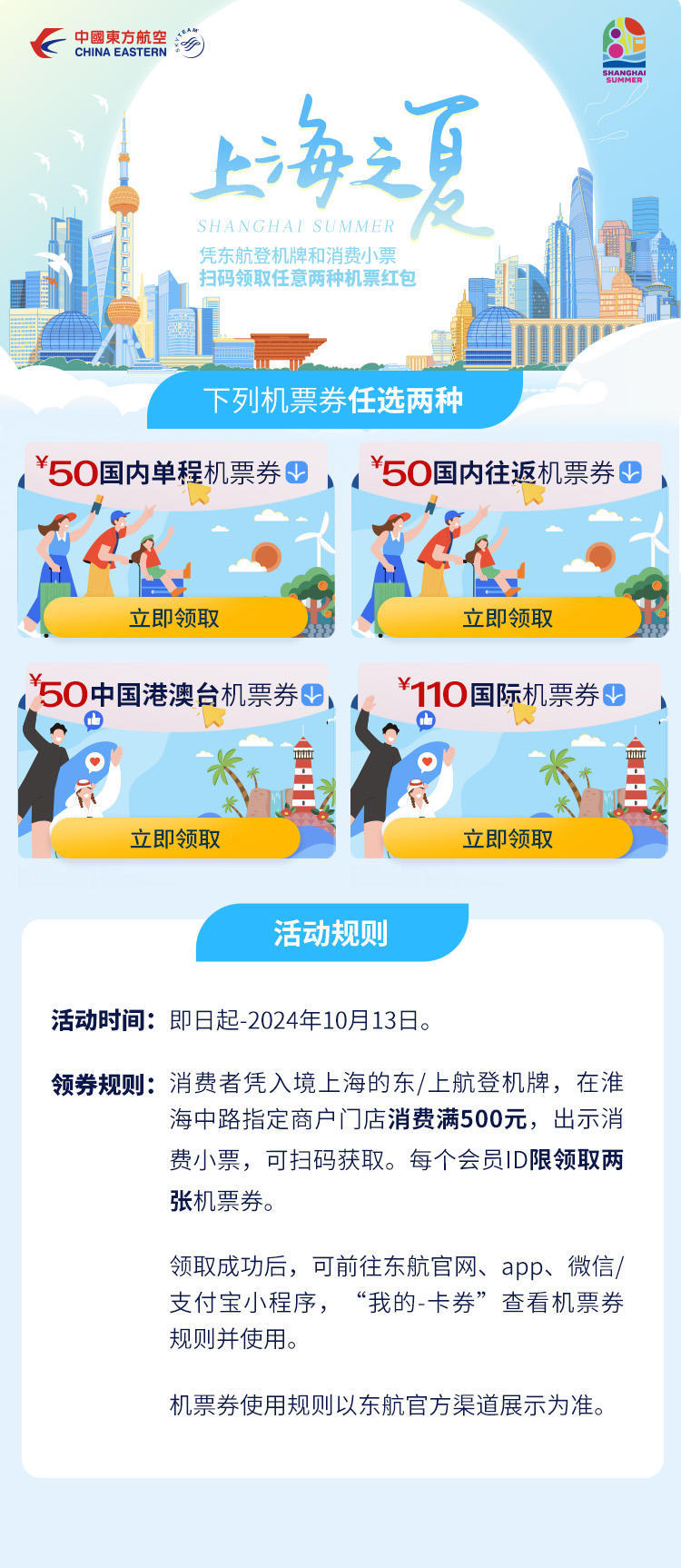 淮海集团与东方航空推出的登机牌换取门店优惠活动精彩继续,消费者凭入境上海的东航登机牌在淮海中路商圈活动商户消费,可享东航专属门店立减、折扣、满赠等特别优惠。同时在淮海路活动商户消费满额500元,即可凭消费小票线上领取东航机票红包券,在东航官网、东方航空APP、微信/支付宝小程序购买东航/上航实际承运的国内、国际及地区机票时可直接抵扣50元~110元机票款。