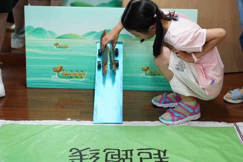 此外,同学们和家长还共同运用生活中常见的物品,齐心协力制作了一款“陆地”龙舟。在限定时间内,孩子们利用瓦楞纸、塑料水瓶、报纸等可回收材料制作“陆地”龙舟,并对车身外观进行包装改造,使其蕴含“龙”元素,让“龙舟”在指定的跑道完成滑行任务,这也考验了同学们的动手能力和思维能力。
