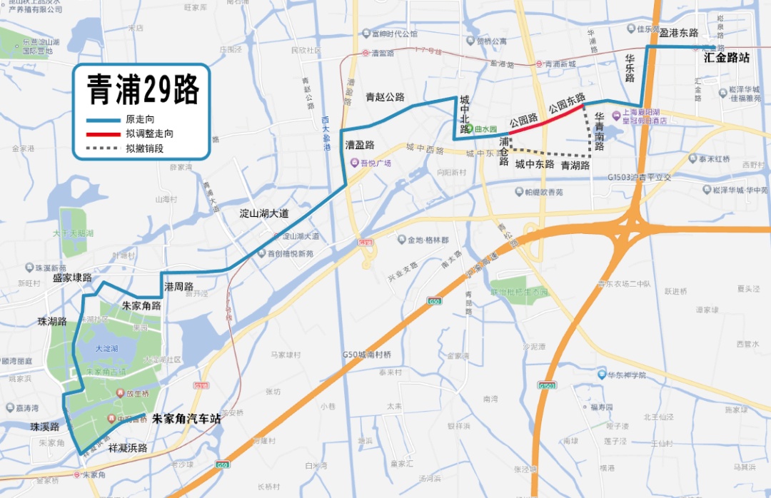 拟调整线路走向:上行自汇金路站起经崧雅路、盈港东路、华乐路、公园东路、公园路、城中北路、青赵公路、漕盈路、淀山湖大道、港周路、朱家角路、盛家埭路、珠湖路、沙淀中路、珠溪路、祥凝浜路、酒龙路至朱家角汽车站止;下行循原线返回。