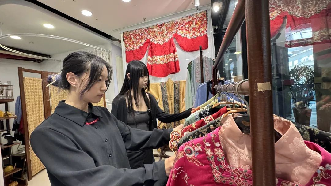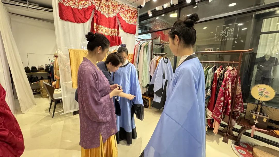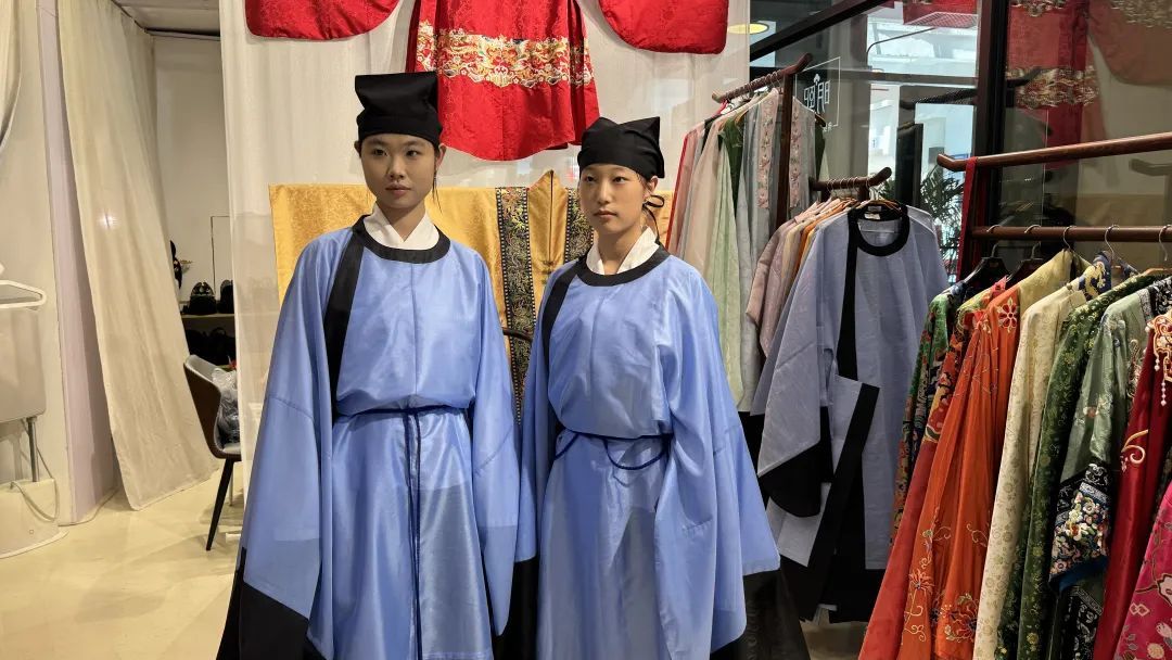 店家告诉记者,“襕衫的形制特点是在衫的下摆处设有一道横襕。襕衫的使用广泛,除作为秀才等士人的服饰外,还用于各地乡学祭孔六佾舞礼生的服饰。襕衫颜色款式多样,颜色有蓝色、白色等,并出现了无膝襕的襕衫。”