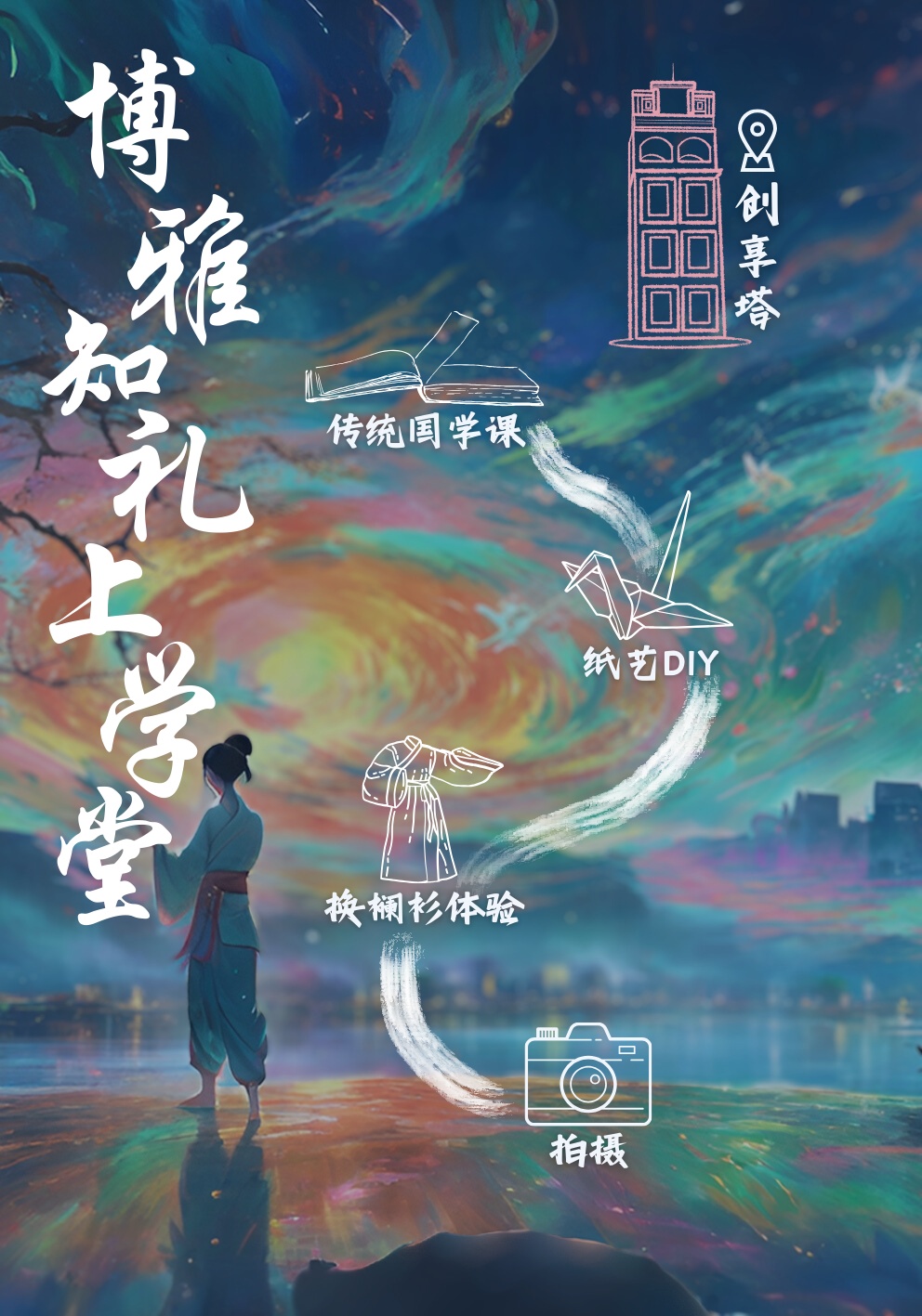 我们换上古代文人之服——襕衫,仿佛穿越到了那个充满诗书礼乐的时代。在这条名为“博雅知礼上学堂”的线路中,通过传统国学课和纸艺DIY,我们了解古代文人礼仪与衣着装束的规制,感受着文人雅客的自我修养在时间的长河中以不同形式代代相承。身着襕衫,静静聆听缠绵婉转的昆曲唱腔,独有一份“琴棋书画诗酒茶”的闲适优雅。中华文化上下五千年,在此时此地缓缓展开,如同一幅精美的历史画卷,每一笔、每一划都诉说着先贤们的智慧与风雅。