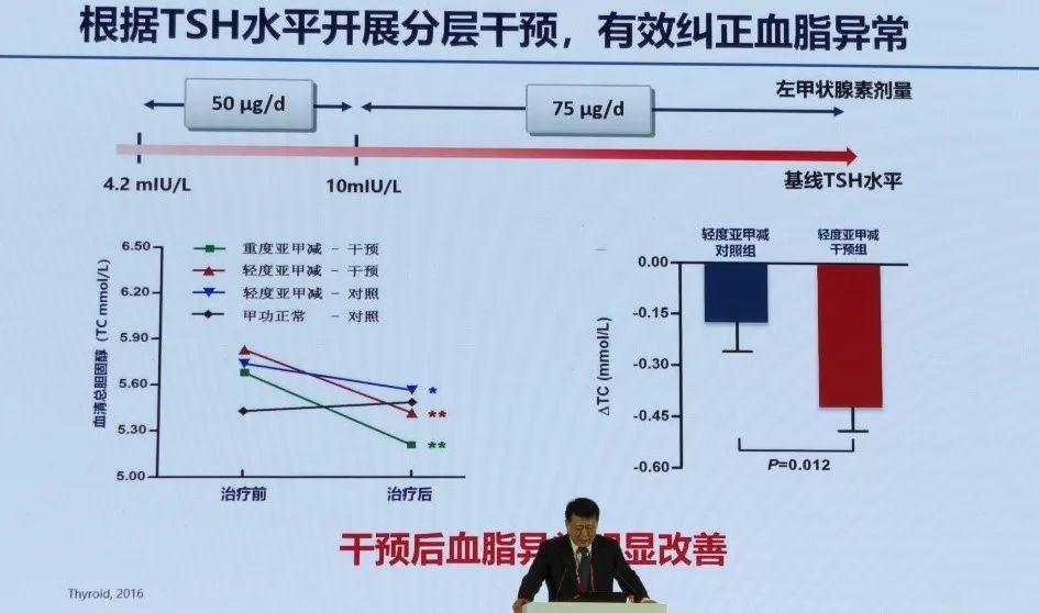 3年随访中,他们发现:轻度亚临床甲减患者在接受治疗干预后总胆固醇水平显著下降,而未接受治疗的对照组患者总胆固醇水平轻微升高接受治疗的患者的动脉粥样硬化新型血清标志物、非酒精性脂肪肝及动脉粥样硬化斑块均获得明显改善,同时研究还发现,治疗干预还可使流产率降低10%,使后代脑发育恢复至正常水平。