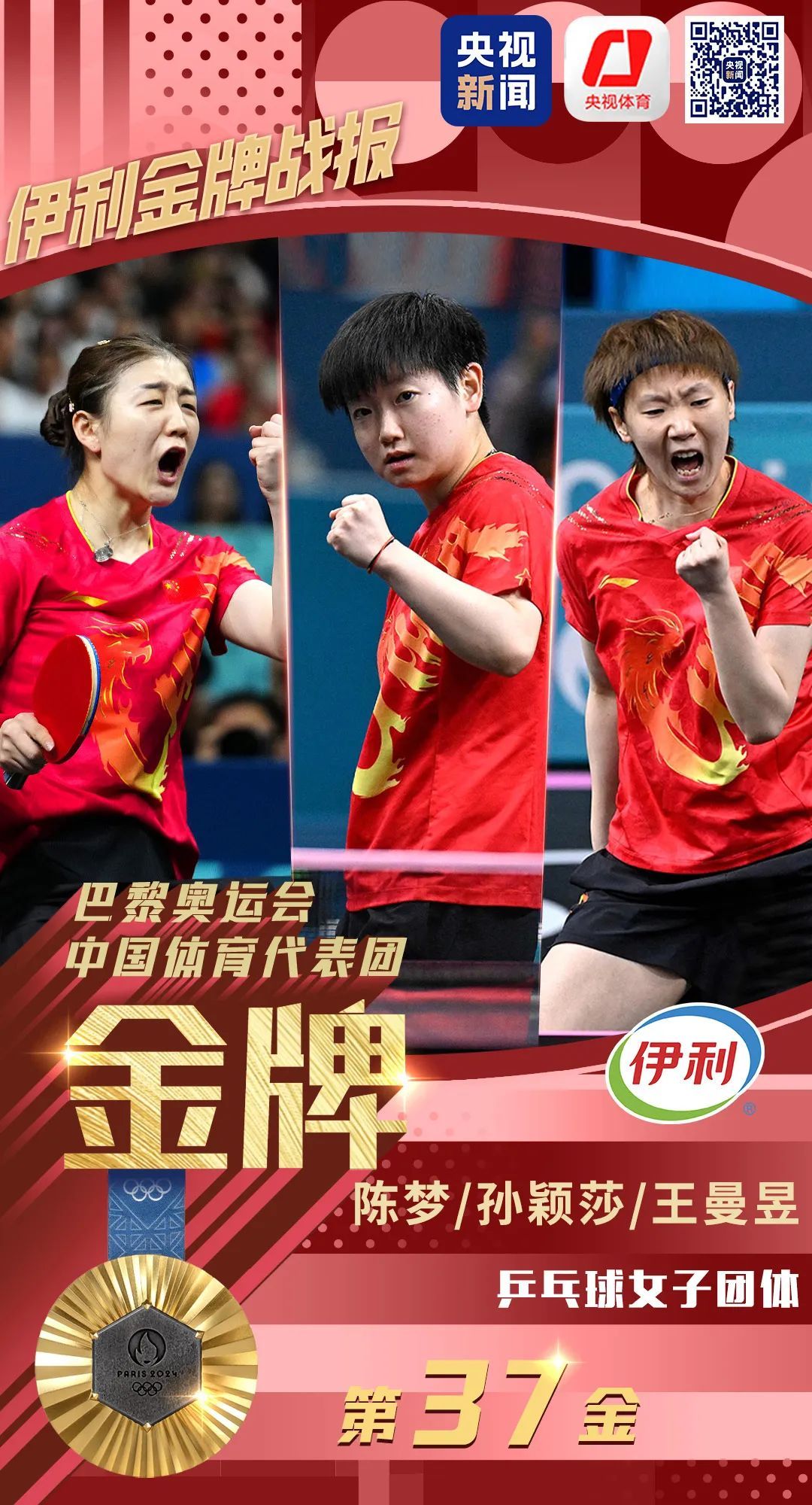刚刚,由陈梦/孙颖莎/王曼昱组成的中国乒乓球女团,以3比0战胜日本队,拿下巴黎奥运会乒乓球女团冠军。这是中国体育代表团在本届奥运会获得的第37枚金牌,也是中国体育代表团夏季奥运会自1984年“零的突破”至今的第300枚金牌!