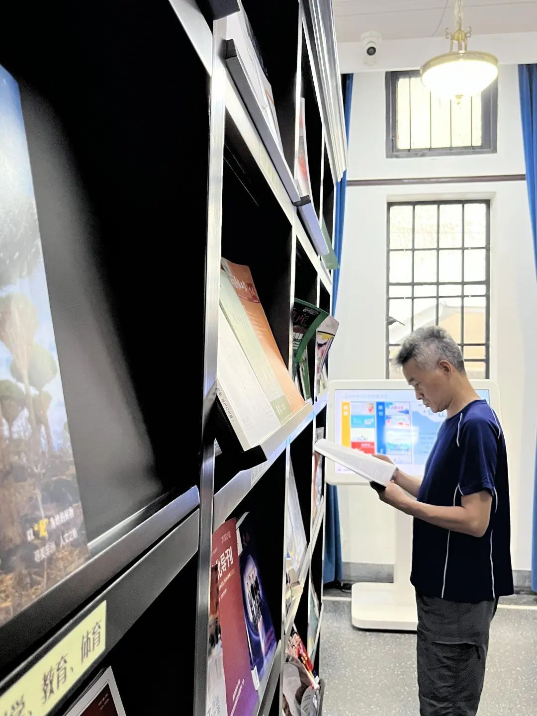 步入主楼明复楼,一楼的报刊阅览室里,中老年读者翻阅着架子上的报纸,聚精会神地阅读,了解时政社会热点。在书架旁,一位老先生正在翻看有关自然科学的期刊,获取学术前沿动态。阅览室一片安静,所有读者几乎都沉浸于知识的海洋里,好似时间都按下了暂停键。