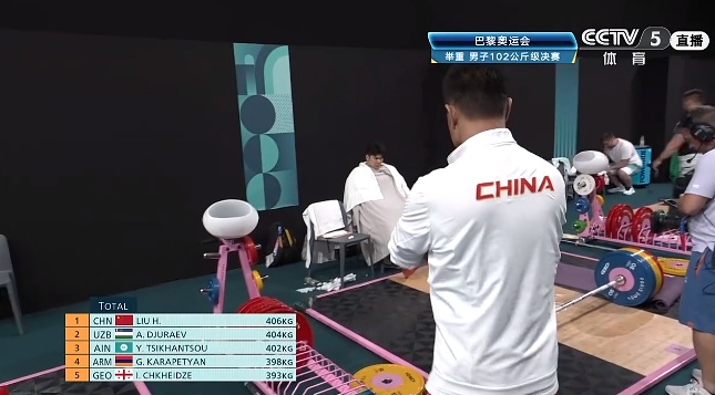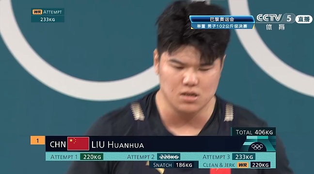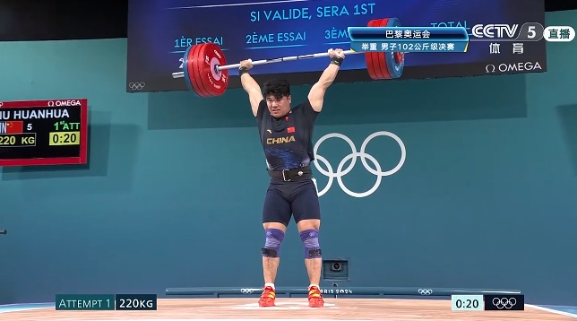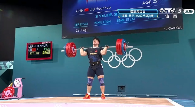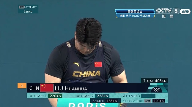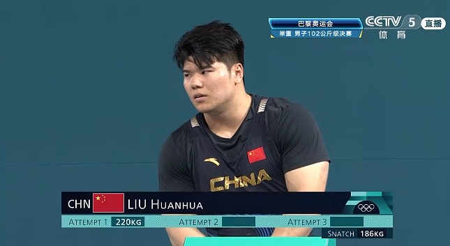 第一次挺举,刘焕华以220KG开把成功,总成绩达到406KG