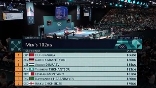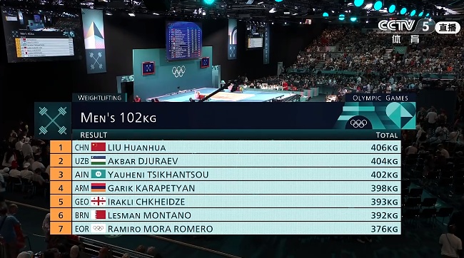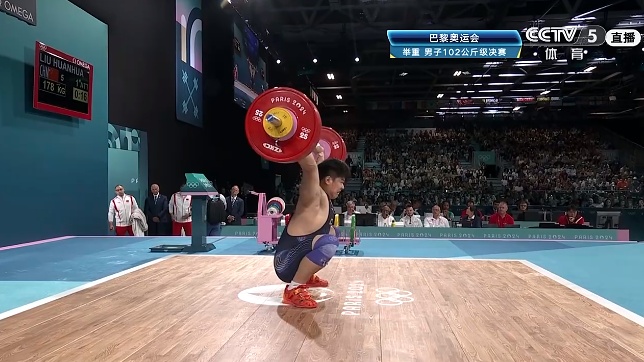 抓举比赛结束,刘焕华以186KG的成绩位列第1