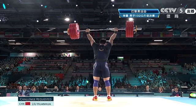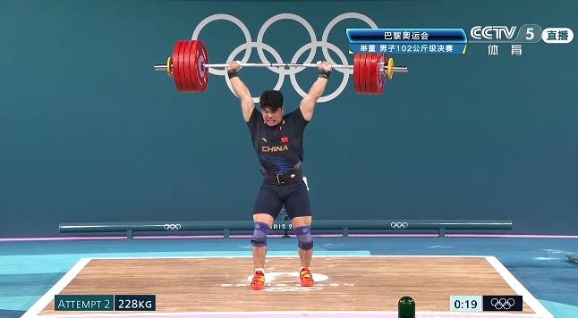 第二次挺举,刘焕华试举228KG,但右侧关节有一点点屈伸,三位裁判中两位给出红灯一位白灯判定失败