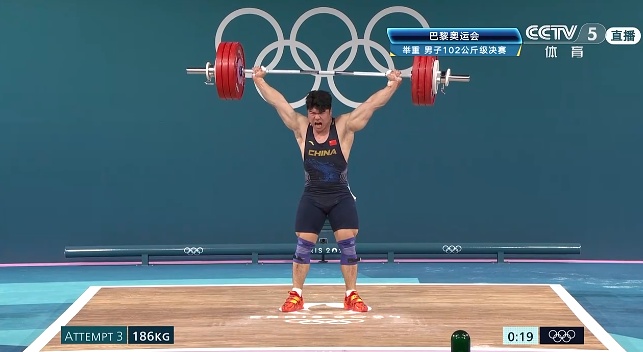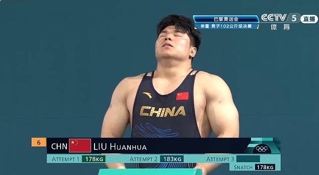 第三次抓举,刘焕华试抓186KG成功,并刷新个人最好成绩,将抓举提高了1公斤
