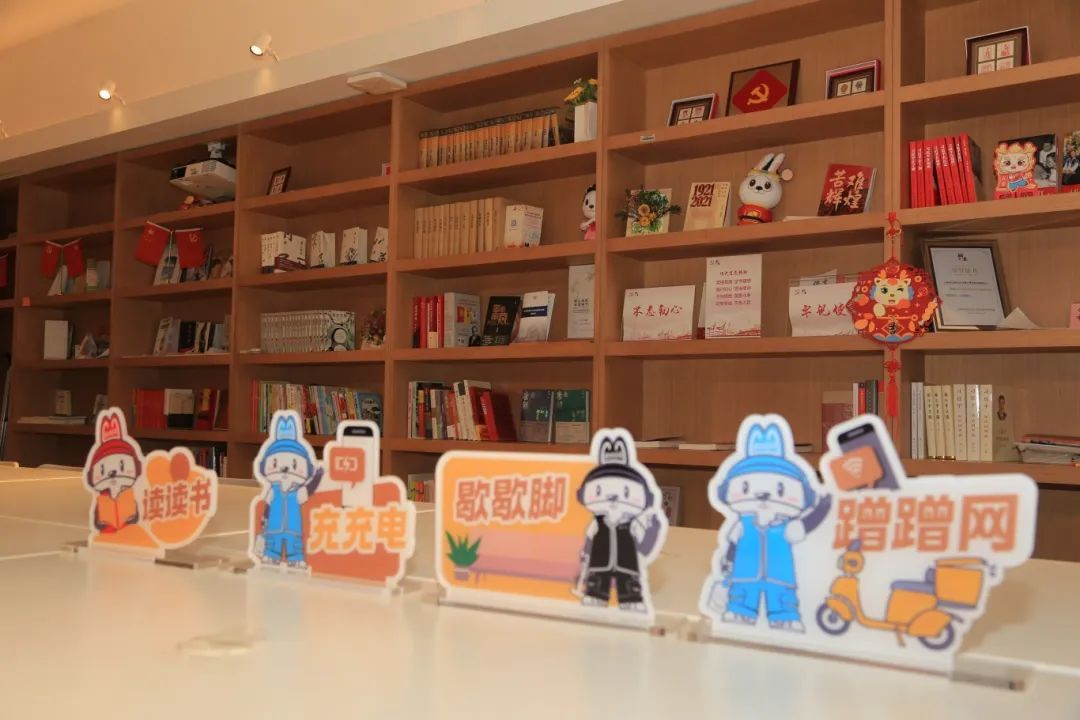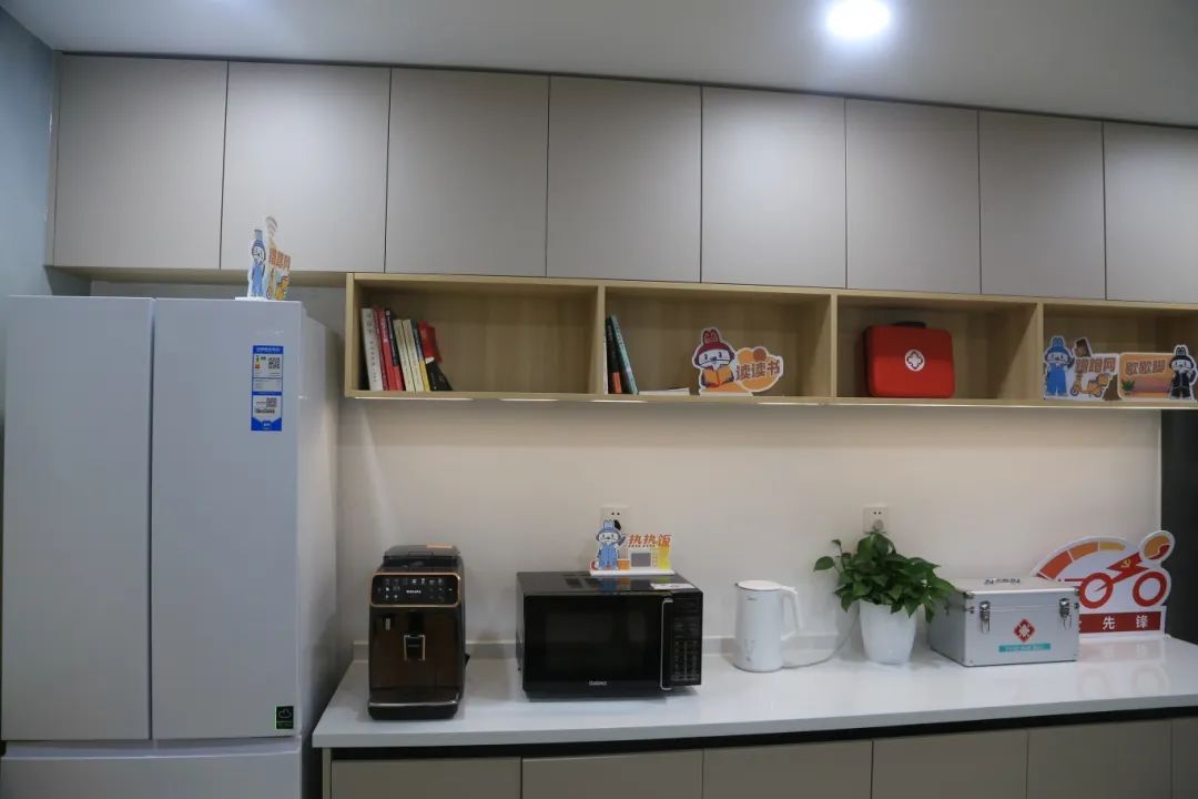 随着沿街居委软硬件设施的进一步完善,居民区党群服务站也承担起重要服务角色。在茶陵日五居民区党群服务站,居民区党总支副书记武伟兵介绍说,这个站点与“叮咚买菜”平台的配送站点比邻而居,因此配备了齐全的设施。最近还在积极筹备图书,开辟出读书一隅,给骑手们充充“精神之电”。