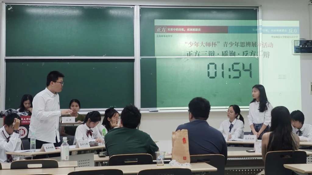 7月21日,同学们在华东师范大学中北校区,与田家炳教育书院与上海市彭浦中学、华东师范大学附属东昌中学就“灾难中的自私,应该/不应该受到谴责”这一辩题展开交锋。
