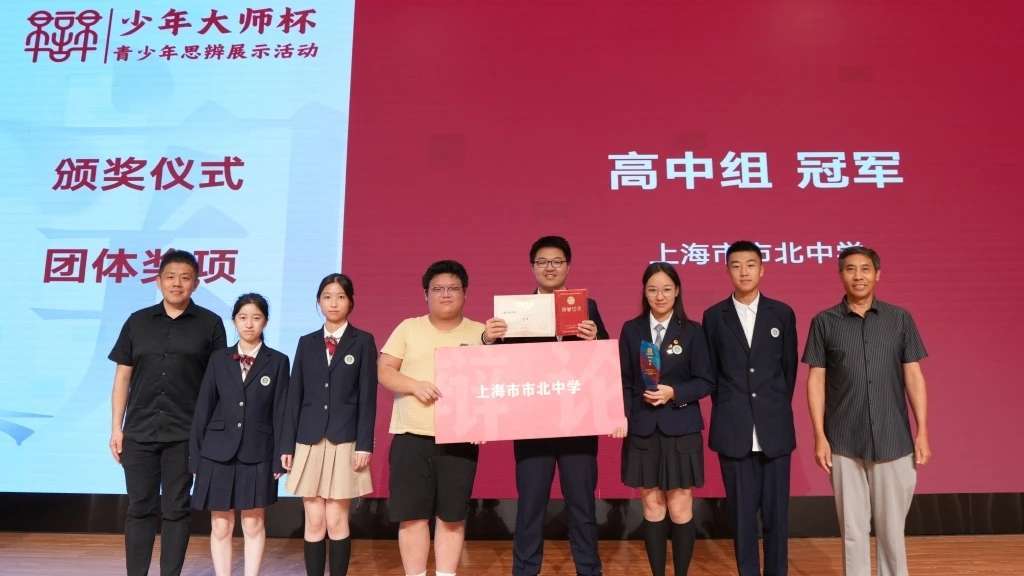 在7月21日至8月4日举办的首届少年大师杯思辨展示活动中,由陈世东、张骏逸老师担任领队,王亦轩、胡庭帝、韩苑元、孙旖旎、薛怡琳、赵宜楷六位同学组成的市北中学天下事辩论队四战四捷,荣获冠军。