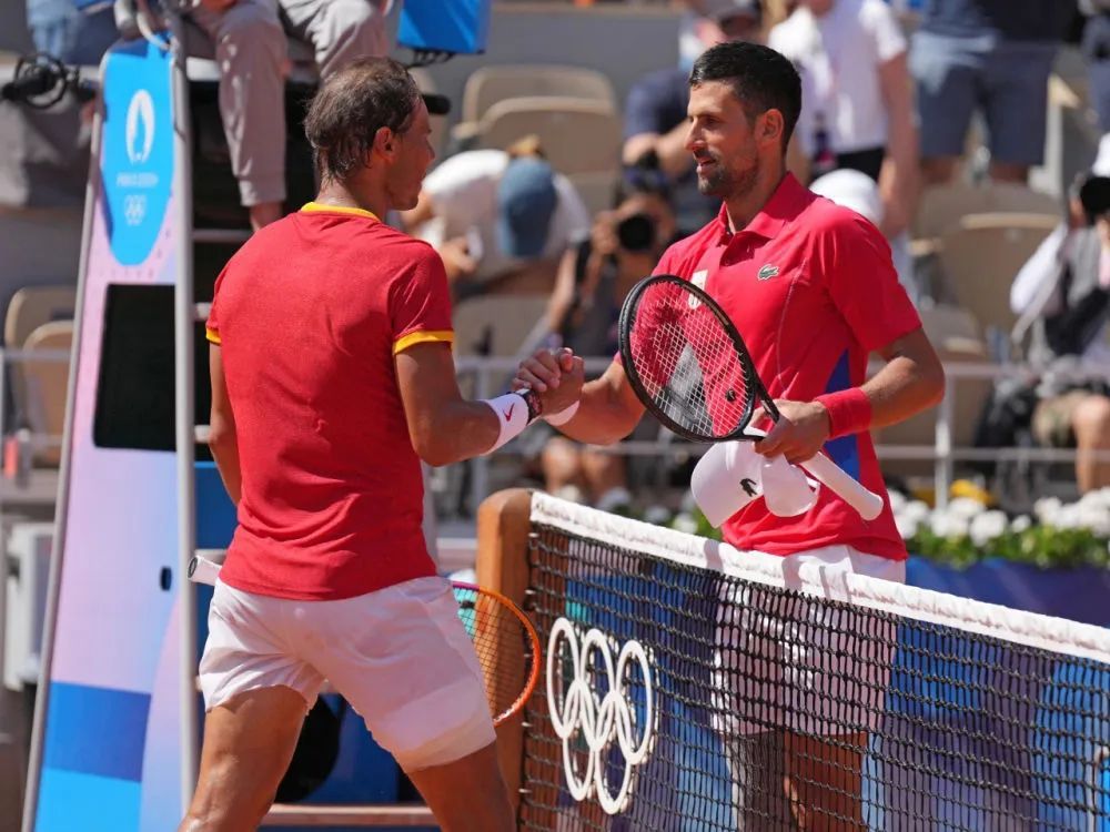 7月29日,纳达尔(左)与焦科维奇在赛后握手。当日,在巴黎奥运会网球男单第二轮比赛中,塞尔维亚选手焦科维奇2比0战胜西班牙选手纳达尔,晋级下一轮。新华社记者 万象 摄