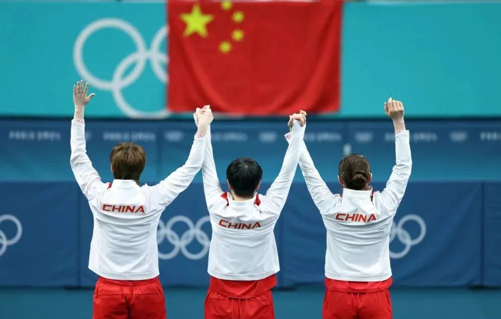 8月10日,冠军中国队选手王曼昱、孙颖莎、陈梦(从左至右)在颁奖仪式上。当日,在巴黎奥运会乒乓球女团金牌赛中,中国队3比0战胜日本队,获得冠军。新华社记者 刘续 摄