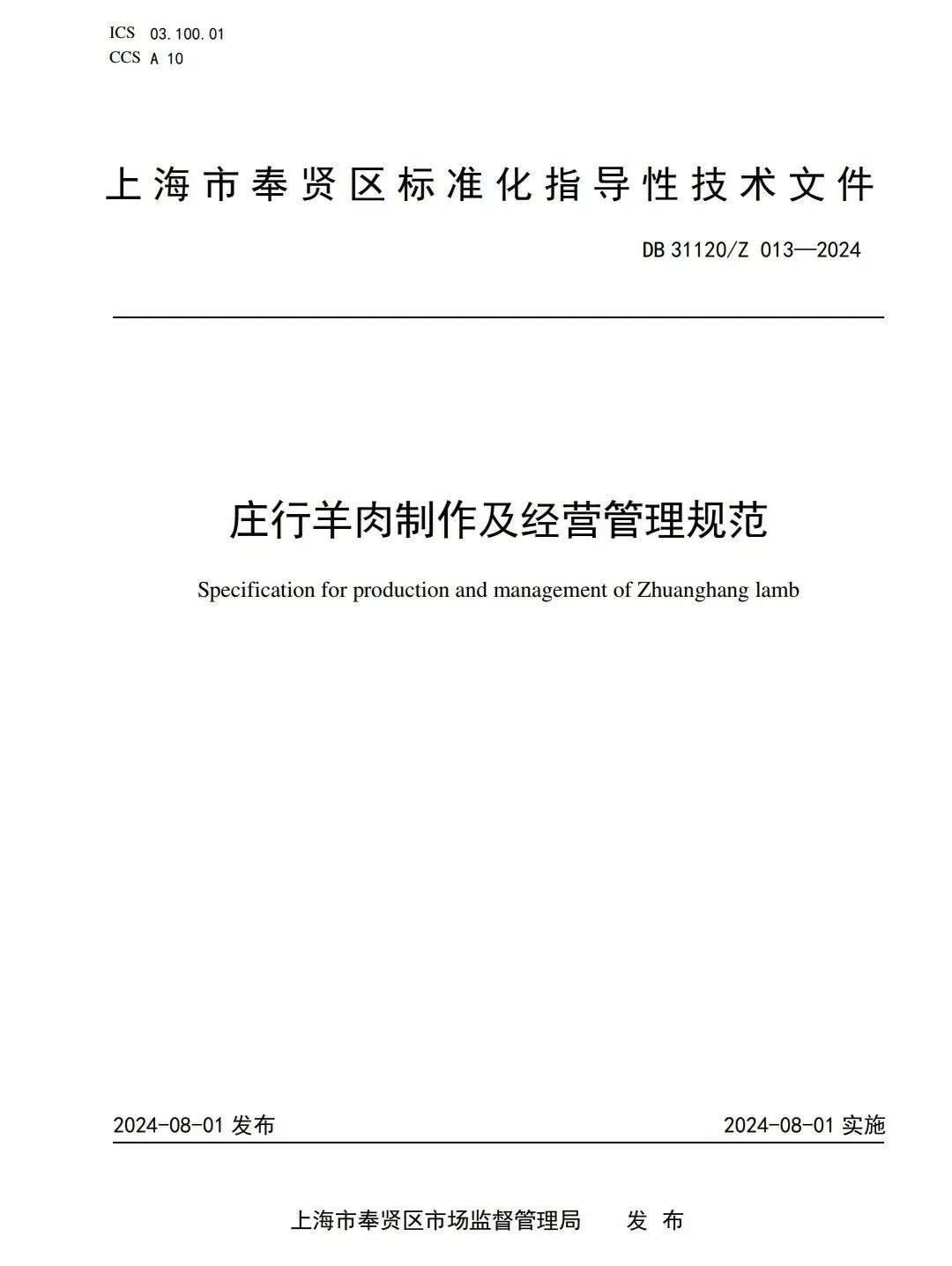 近日,经上海市奉贤区人民政府批准,上海市奉贤区市场监督管理局发布DB 31120/Z 013—2024《庄行羊肉制作及经营管理规范》(点击文末“阅读原文”查看文件详情)。作为奉贤区首个美食类的区级标准,将标准的“严谨”和美食文化的“意蕴”深度结合,助力打响“伏羊文化”金字招牌,弘扬奉贤特色饮食文化。