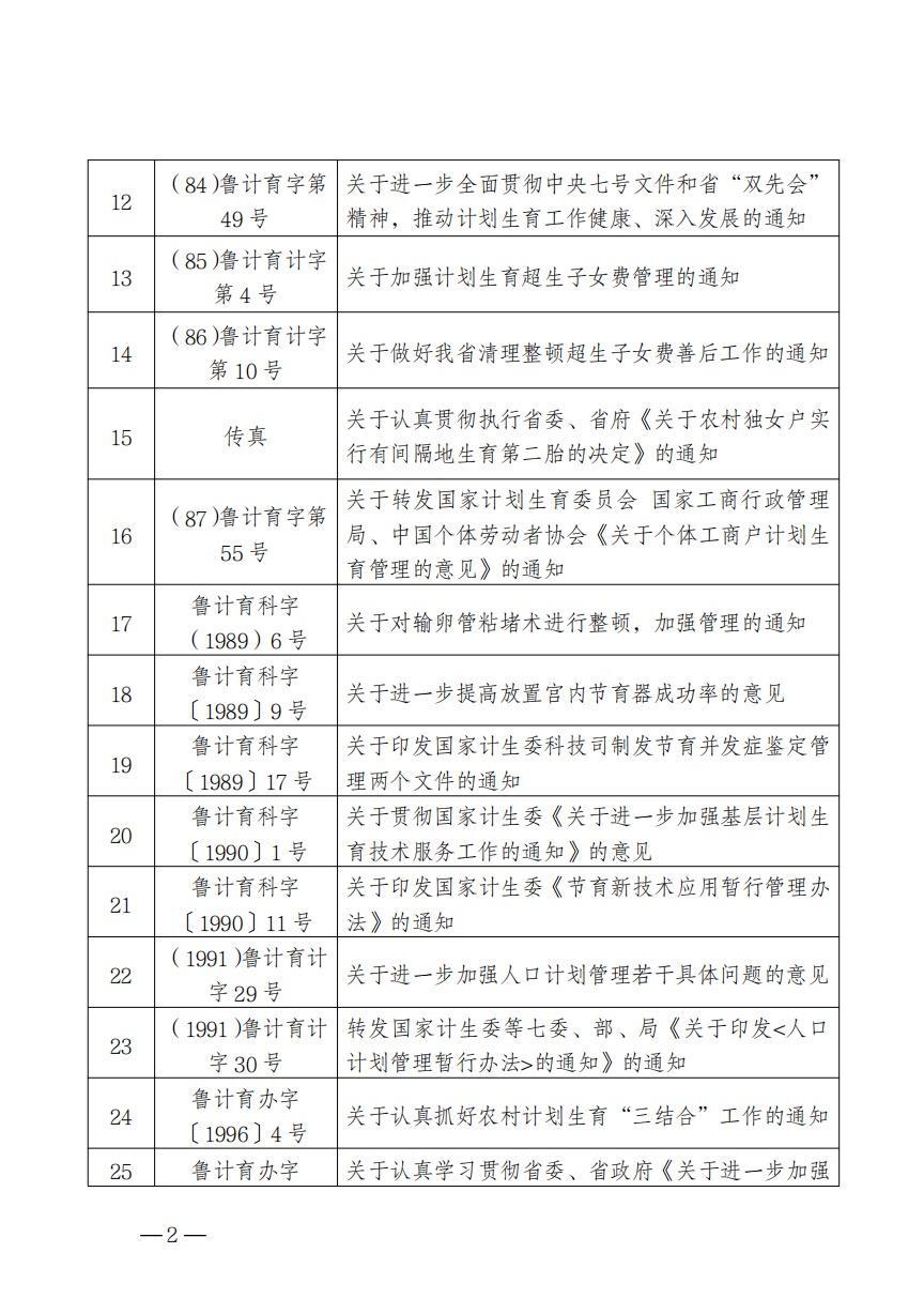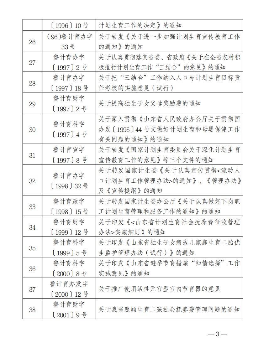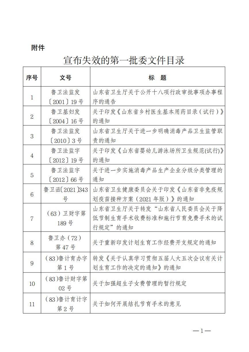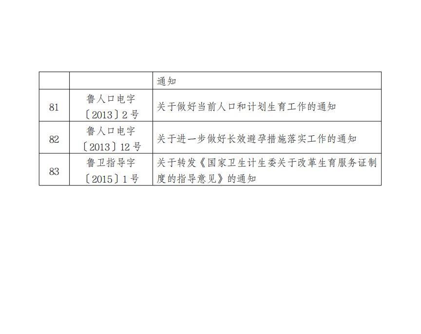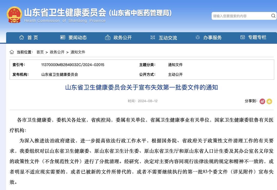 为深入推进法治政府建设,进一步提高依法行政工作水平,近日,山东省卫生健康委对以山东省卫生健康委、原山东省卫生计生委、原山东省卫生厅和原山东省人口计生委及其办公室名义印发的政策性文件(不含规范性文件)进行了分批清理。经研究,决定对主要内容同现行法律法规的规定和精神不一致的,或者明显不适应现实需要的,或者已被新的文件所替代的,或者不需要继续执行的第一批83个委文件宣布失效。