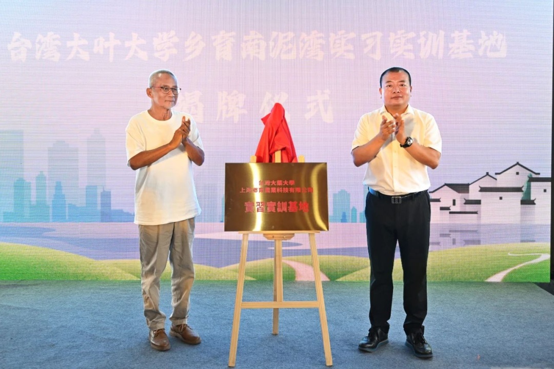 台湾大叶大学教授、跨界自造策略长黄柏龄与上海乡育农业科技有限公司创始人蒋卫兵为“台湾大叶大学乡育南泥湾实习实训基地”揭牌。