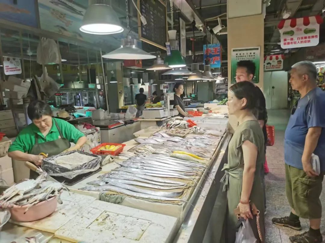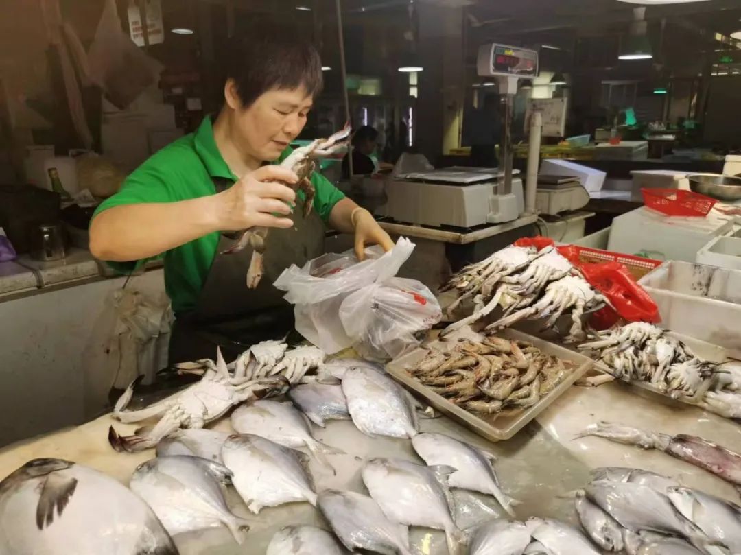 随着东海3个月的伏季休渔期结束,上海市民最爱的海鲜陆续上市。近日上午9点,在长宁美天太阳菜市场二楼的各个海产品摊位前,银亮的带鱼、肥美的梭子蟹、条虾、鱿鱼等新鲜饱满的东海海鲜摆得满满当当,浓郁的海鲜味扑鼻而来,吸引了不少居民前来购买尝鲜。