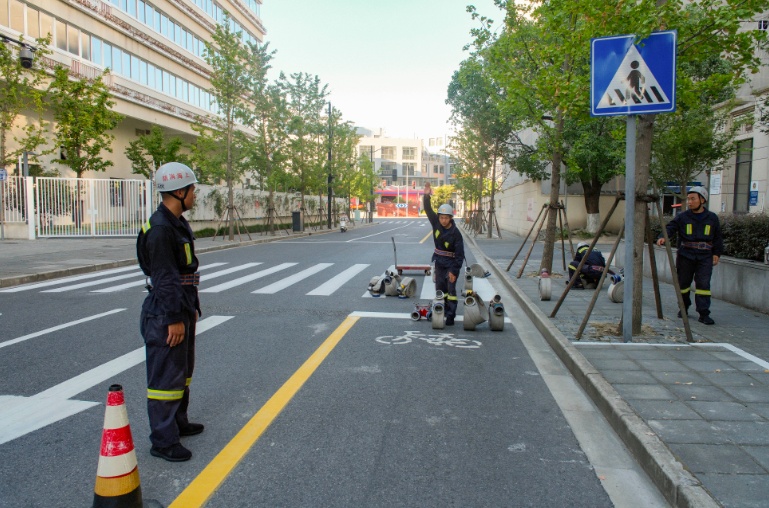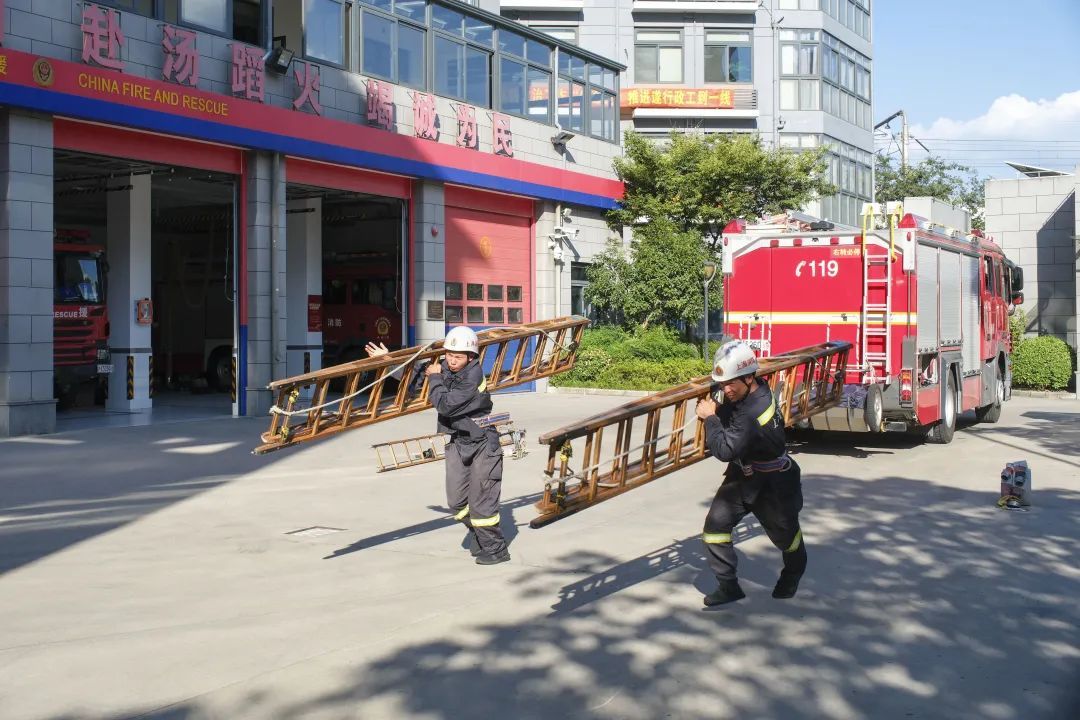 消防员的必训科目共有百余项,当天指战员训练的项目有三个,分别是:架设六米拉梯操、楼层火灾一号操、百米铺设水带操。接下来,就请跟着记者的视角,一起感受徐汇区南站消防救援站指战员们的训练风采吧。