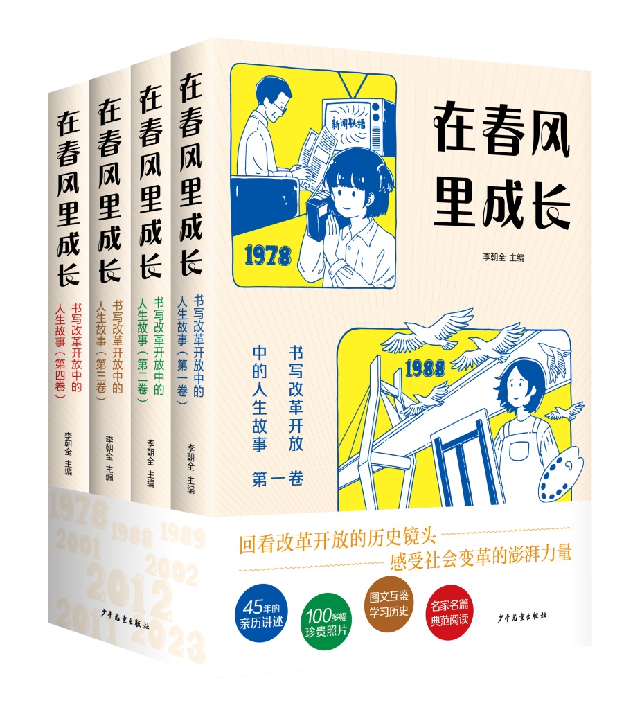 《在春风里成长:书写改革开放中的人生故事》(全4册)以时间为线、故事为点,用图文并茂的形式,为青少年读者全景式展现了中华大地上40多年的历史性变革与成就。作家们以少儿视角,讲述个人成长、家庭生活、自然环保、科技发展和社会变迁等丰富主题,每一篇作品都是一幅生动的画卷,展现改革开放为人民生活与社会发展带来的巨变,以此向青少年读者传递改革开放精神的深刻内涵。