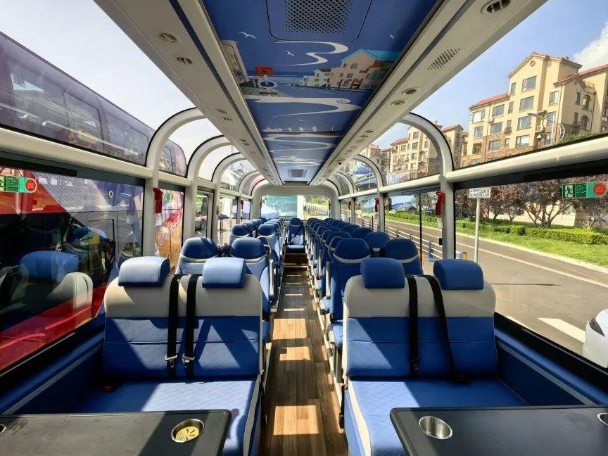 早上9点左右,记者来到巴士的始发站半月湾北岸停车场,远远就看到了一辆高颜值观光巴士,靓丽的红色车身,大视角穹顶天窗,在“车”群中格外引人注目。登上巴士,记者更是被精致的设计打动,两侧及顶部的车窗玻璃洁净如洗,视野非常开阔,车顶绘有刘公岛等极富威海城市特色的设计元素,两排蓝色沙发座椅让人在炎热的季节感受到丝丝清凉。