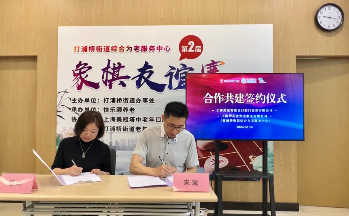 除了精彩的象棋比赛,活动中还举行了一项特别的签约仪式。上海莳花斋养老服务有限公司(打浦桥街道综合为老服务中心)与上海美冠塔中老年口腔签署了为老服务共建协议。根据协议,双方将在未来携手合作,为打浦桥社区老人提供更多元化、更贴心的服务。