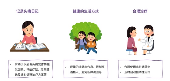 第一,记录头痛日记,有助于识别偏头痛发作的触发因素、评估疗效,定期随访及适时调整治疗方案等;