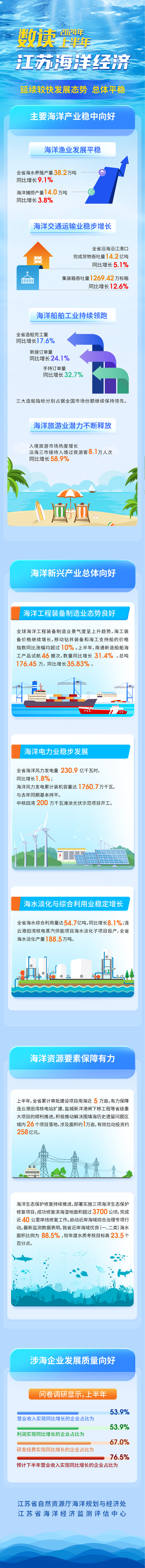 交汇点讯 8月15日,江苏省自然资源厅发布了2024年上半年江苏海洋经济相关数据。总体来看,今年上半年江苏海洋经济延续较快发展态势,海洋渔业、海洋交通运输业、海洋船舶工业等主要海洋产业稳中向好,海洋工程装备制造业、海洋电力业等海洋新兴产业总体向好,海洋资源要素保障有力,涉海企业发展质量向好。