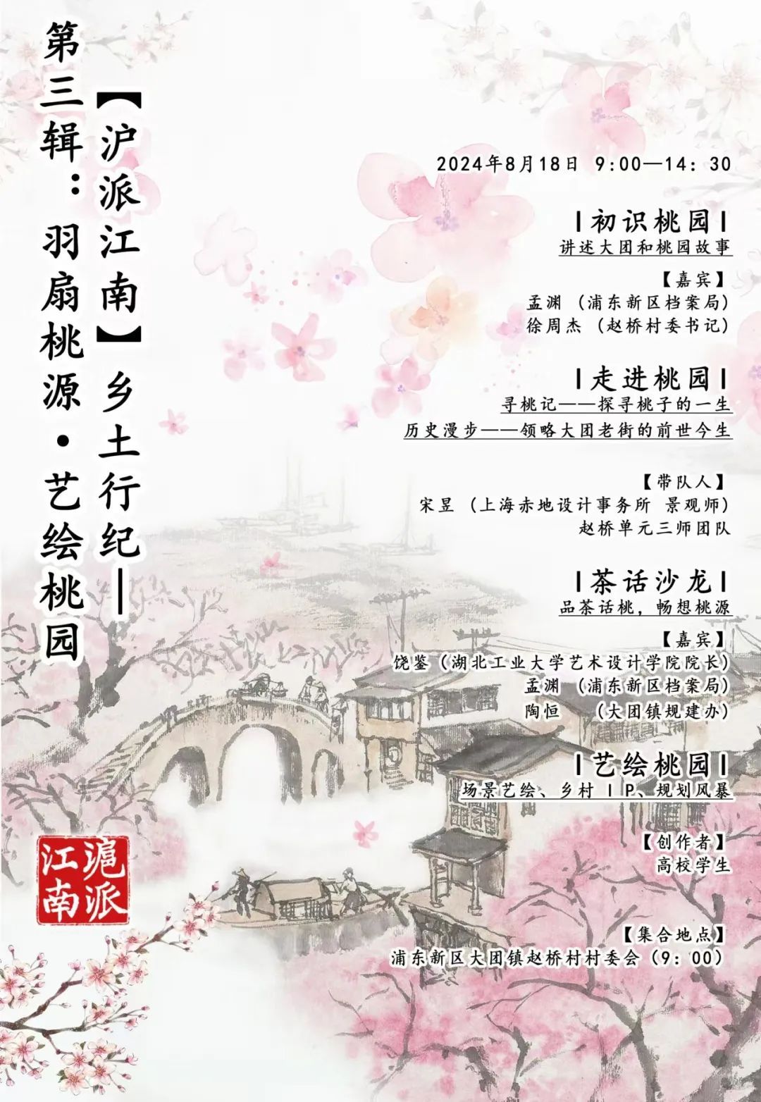 江南的诗意美景,不仅在古人的笔下绽放,也在今人的心中流转。为传承与再现这一美好意境,“羽扇桃源·艺绘桃园”乡土行纪,由“三师团队”代表、“赤地设计”景观师宋昱老师组织,将带领高校师生深入考察桃园,通过大学生的艺术创作描绘理想的“桃花源”。这不仅是一场集体艺术创作,更是探索与展现沪派江南特色村落保护与传承的行动。