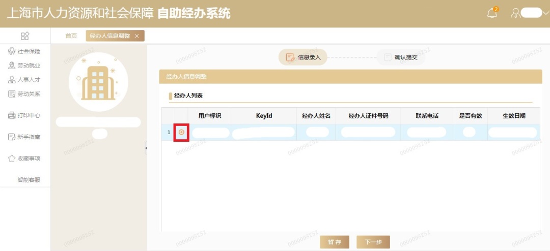在下方“经办人信息编辑”一栏中,可以修改经办人姓名、经办人证件号码、联系电话、菜单权限等内容。录入完成后,点击“下一步”。