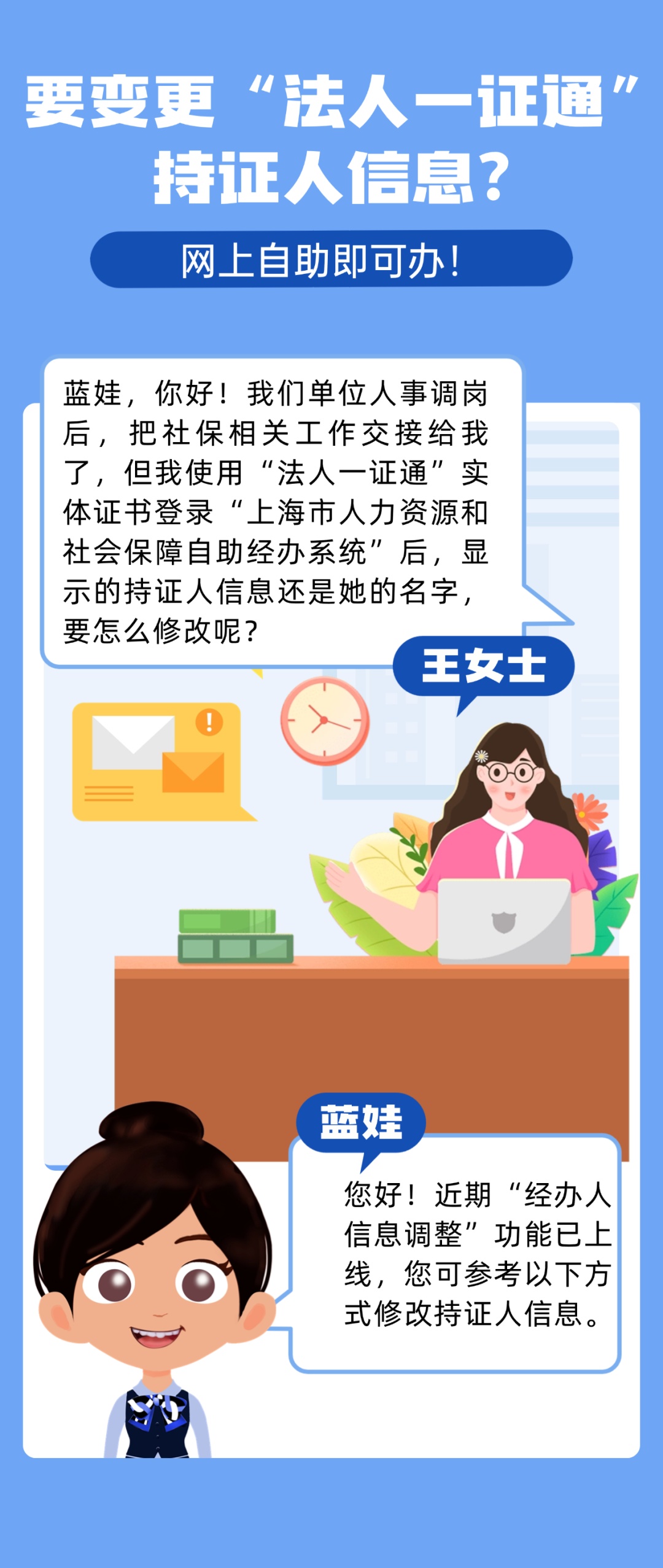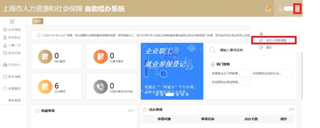 使用单位数字证书主key登录“上海市人力资源和社会保障自助经办系统”,点击右上角经办人姓名右侧的下拉箭头,选择“经办人信息调整”。