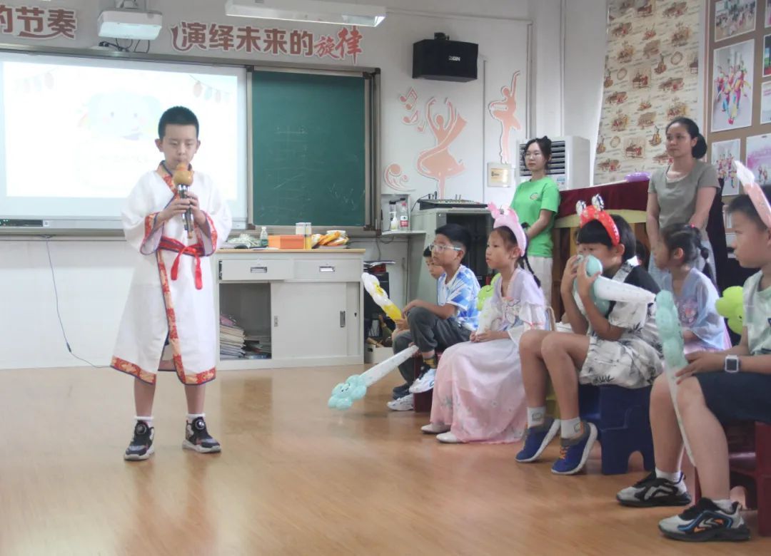 “我今天表演的是葫芦丝曲子《湖边的孔雀》!”望新小学学生袁一函兴奋地介绍着,随着指尖移动,悠扬的旋律被吹响,音色独特淳朴,引得小朋友们的阵阵掌声。说到三周的暑托班,袁一函也热情地分享着自己最喜欢上的手工课,“手工课不仅让我学会了用手创造美好,还培养了我的耐心和细心”。
