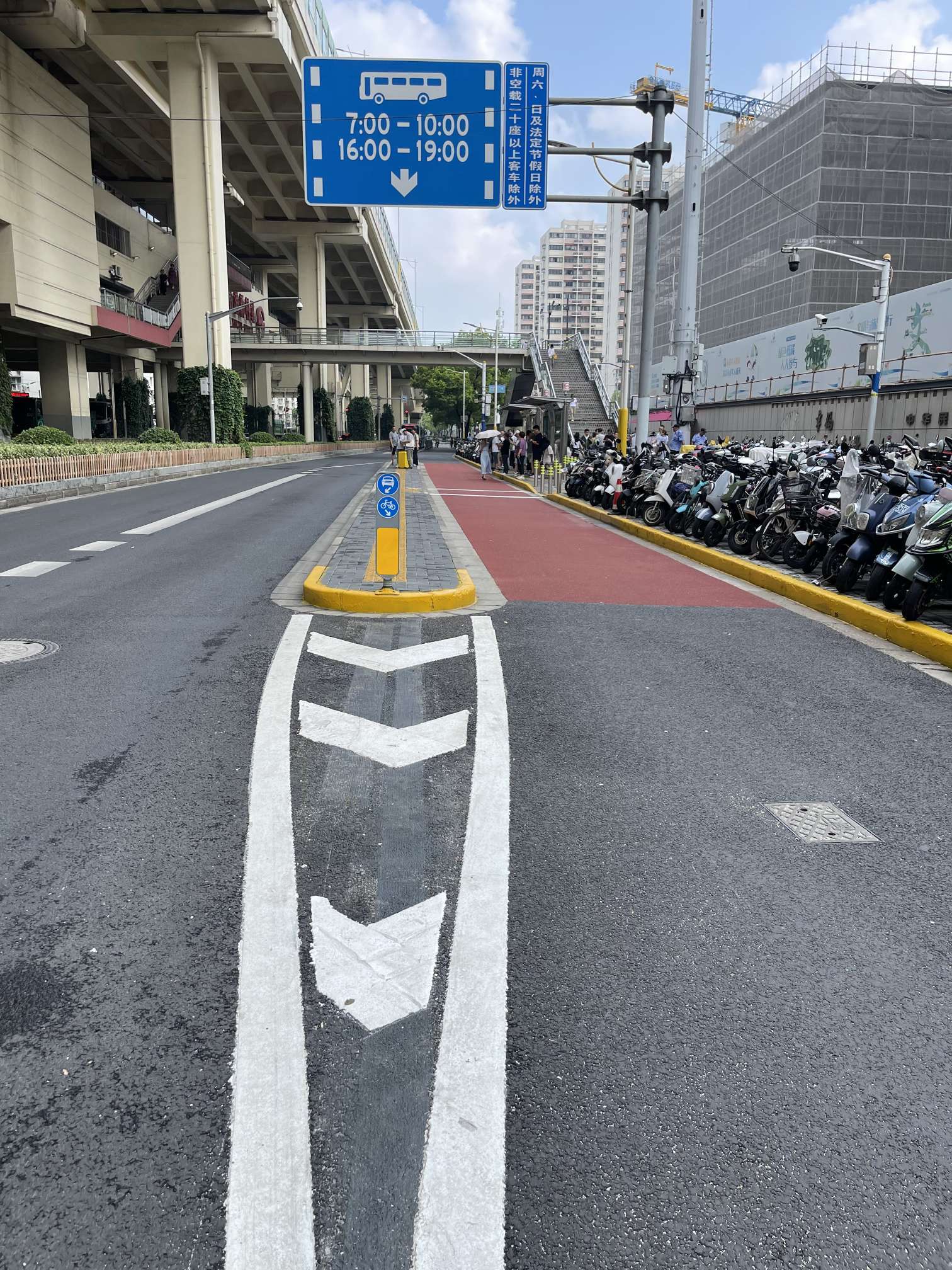 为解决公交候车岛过窄的问题,此次改造将此处公交专用车道外侧辅道由4.1米调整到3.6米,将1米宽的候车岛增加到1.5米宽,还对候车岛范围内的非机动车道进行了沥青彩铺,并在候车岛端头设置警示柱,以提醒非机动车通过此处需减速慢行,小心行驶。