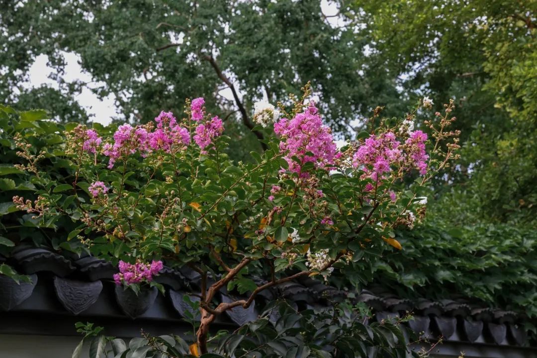 在醉白池公园的雪海堂、雕花厅、盆景园附近,紫薇花的花朵已开满了树梢,微风吹过,轻盈的紫薇花随风舞动,美不胜收。