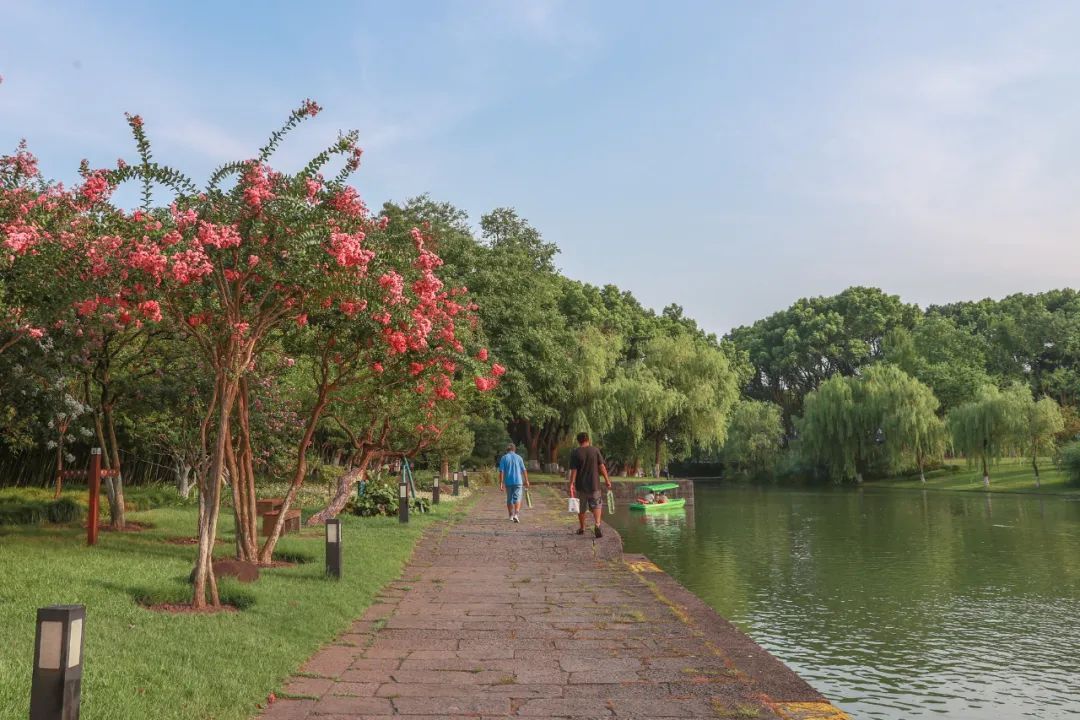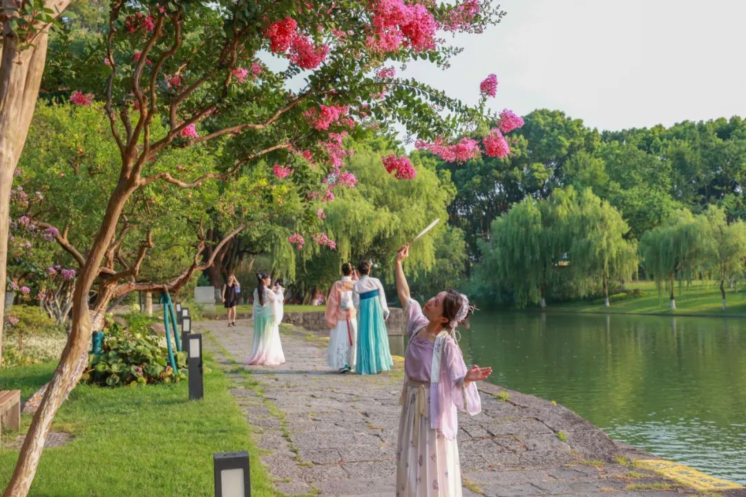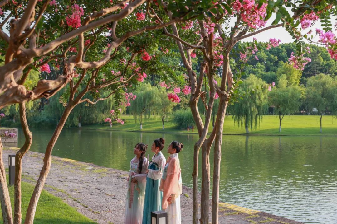在方塔园大草坪河岸附近,记者看到,一株株芬芳艳丽、姿态优美的紫薇花开正艳,玫红、淡粉、深紫、浅白等颜色的花朵妆点着道路一侧。据了解,方塔园内共栽有紫薇三十余株,其中北大门处的六棵紫薇树长势尤为喜人。