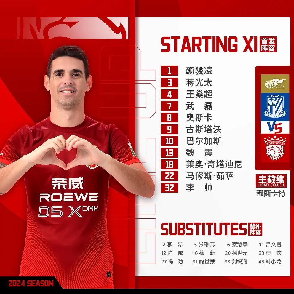 1-颜骏凌、4-王燊超、3-蒋光太、13-魏震、32-李帅、18-奇塔迪尼、22-茹萨、8-奥斯卡、10-巴尔加斯、9-古斯塔沃、7-武磊