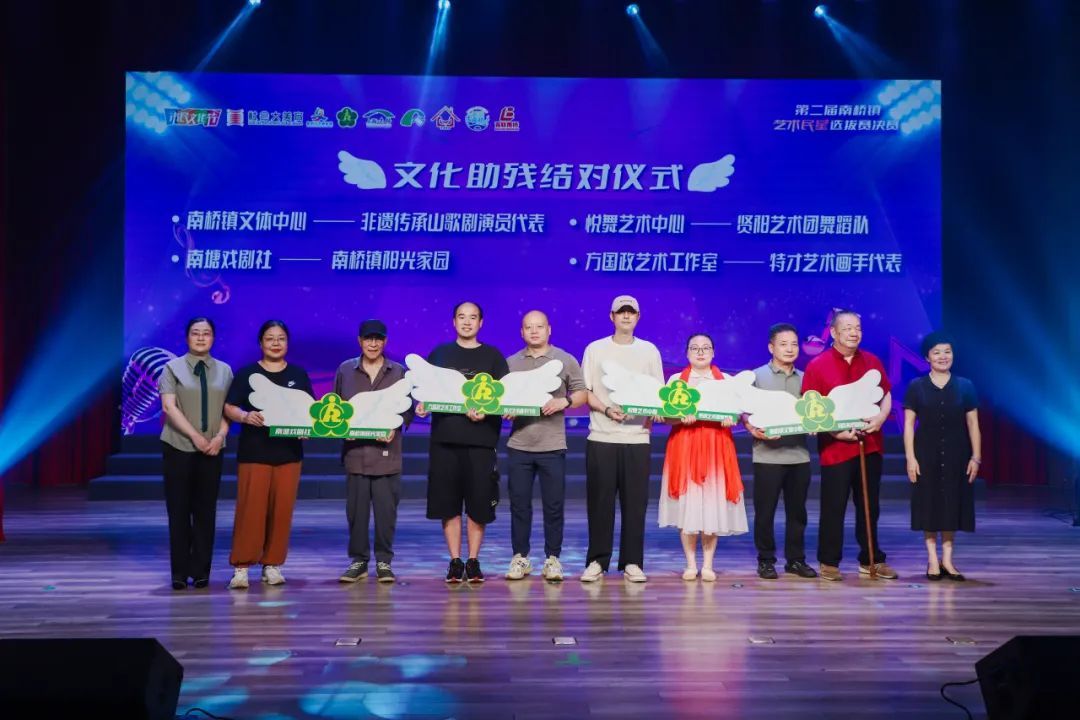“艺术民星”选拔赛自去年举办,亮点纷呈、氛围热烈。今年又增设残疾人赛道,为更多平凡而富有才华的残疾人搭建了实现梦想的舞台,激励他们能够自尊、自强、自信、自立,更加勇敢地迎接生活的挑战。比赛开始前,南桥镇文体中心、南塘戏剧社、悦舞艺术中心等分别与本届艺术民星12强选手蔡建国、贤阳艺术团、阳光家园学员代表等举行“文化助残结对仪式”。